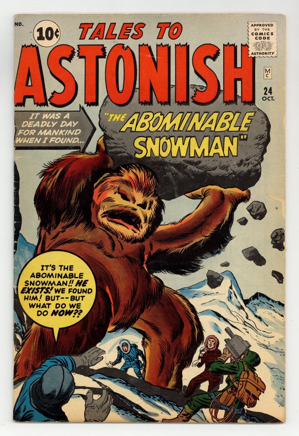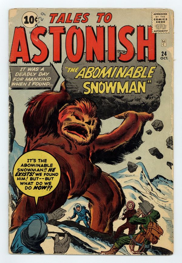 Cover by Jack Kirby and Dick Ayers. I Found the Abominable Snowman! Part 1, art by Jack Kirby and Dick Ayers; A TV producer fakes a film of the Abominable Snowman in the arctic, but runs afoul of an ancient underground civilization of lizard-men and a giant octopus. The Snowman's Secret!, art by Jack Kirby and Dick Ayers. The Recipe text story. Something Missing!!, art by Don Heck; The first mission to Mercury has a stow-away, the lover of one of the pilots. He Waits in the Dark!, script by Stan Lee, art by Steve Ditko; A mysterious janitor comes to work for a slumlord, but he has strange powers and ends the man's evil ways. 36 pgs., full color. $0.10. Cover price $0.10.