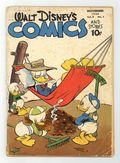 Cover by Walt Kelly. Stories and art by Carl Barks, Floyd Gottfredson, Dick Moores, Bill Walsh, Bob Karp, Hubie Karp, Carl Buettner, George Waiss, Manuel Gonzales, Sylvia Holland, Bill Wright, and Al Taliaferro. Sometimes listed as Vol. 5 #2. The long-running vehicle for Disney character comics featured work by Carl Barks, Floyd Gottfredson, and Pogo's Walt Kelly. In a classic Floyd Gottfredson story from the Mickey Mouse comic strip, Mickey helps refugee children escape WWII. In a story by Barks, Donald accidentally gives the kids a rare dime worth five hundred dollars, and after they buy ice cream with it, he has a hard time getting it back. In another story, Jose Carioca and Panchito visit Donald Duck for a Caballeros reunion, but a police officer is watching them. Donald Duck; Bucky Bug; Mickey Mouse; The Three Caballeros; Dog Watch; The Strange Catch; Sporting Blood; Hush Money; The Wearing of the Grin; Quack Doctor; High But Not Dry; Mickey Mouse and the War Orphans. 48 pages, Full Color. Cover price $0.10.