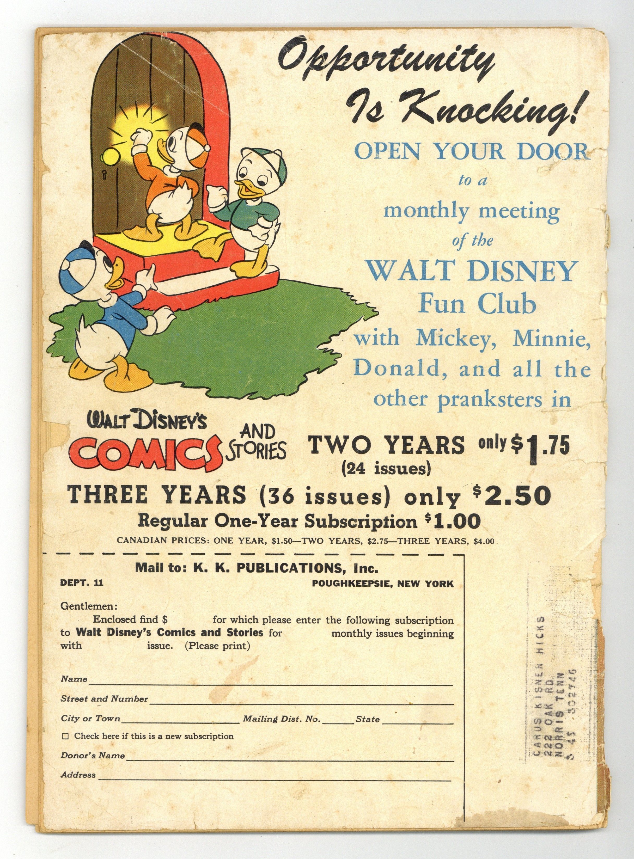 Tags: Disney Ducks & MicePublished Nov 1944 by Dell/Gold Key.$60.00- Cover detached at one staple.