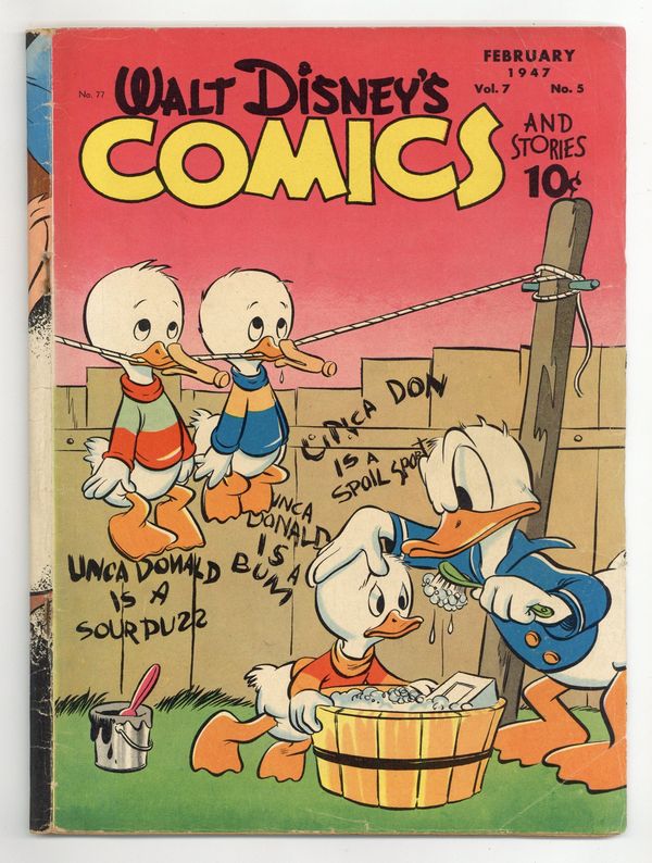 Tags: Disney Ducks & MicePublished Feb 1947 by Dell/Gold Key.$29.00Cover by Walt Kelly. Stories and art by Carl Barks, Floyd Gottfredson, Bill Walsh, Bob Karp, Hubie Karp, Roger Armstrong, George Waiss, Bill Wright, and Al Taliaferro. Sometimes listed as Vol. 7 #5. The long-running vehicle for Disney character comics featured work by Carl Barks, Floyd Gottfredson, and Pogo's Walt Kelly. In a classic story from the Mickey Mouse comic strip, Mickey's new landlord wants to evict him. In a story by Barks, Donald's nephews go to great lengths to convince Donald that his homemade bug spray creates giant bugs. Bucky Bug gets help from Santa when a discarded Christmas tree threatens to crush the town. Donald Duck; Bucky Bug; Li'l Bad Wolf; Mickey Mouse; Goofy: The Big Wash; Br'er Rabbit; The New Idea; Straight Shooters; Mickey Mouse: Eviction. 48 pages, Full Color. Cover price $0.10.