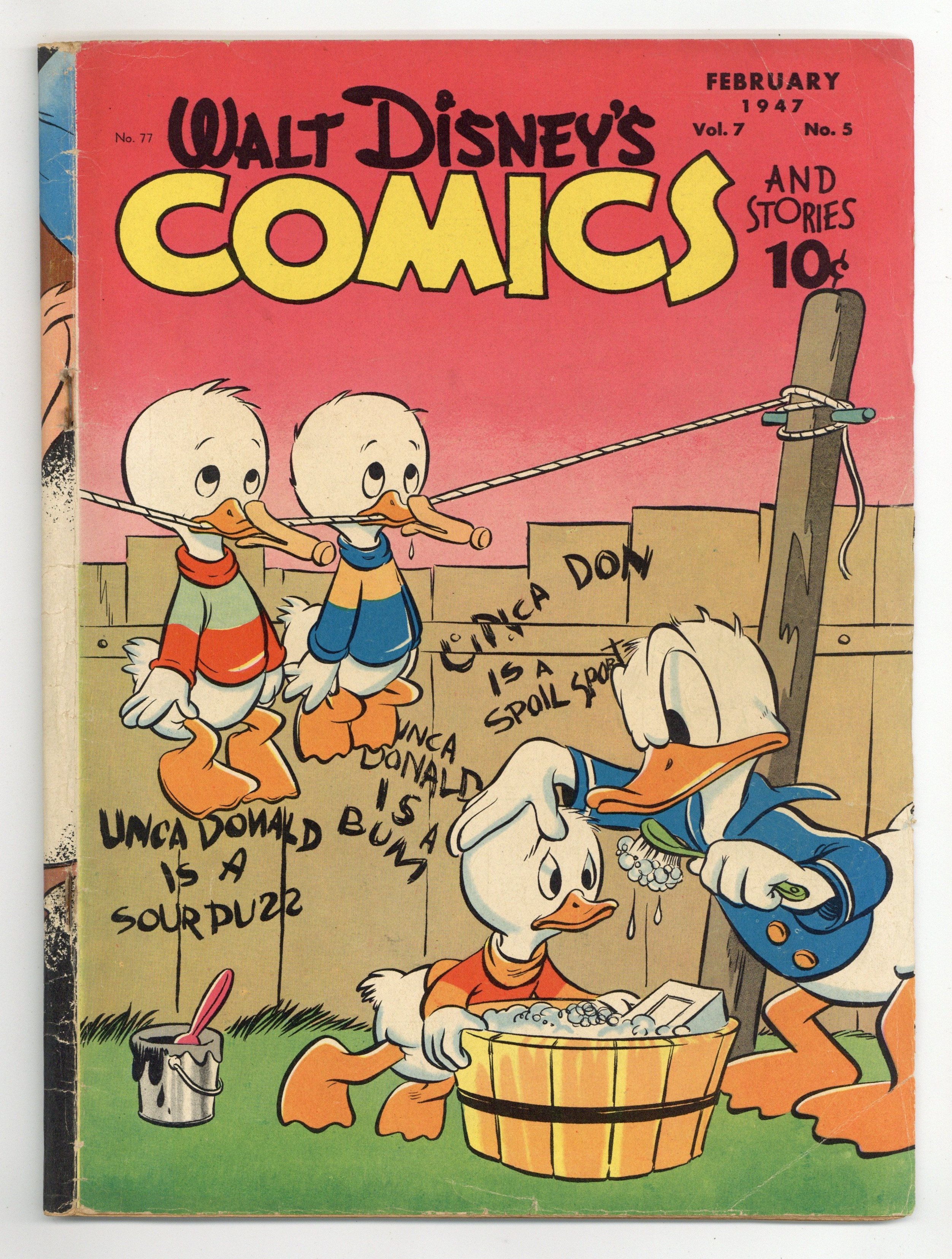 Tags: Disney Ducks & MicePublished Feb 1947 by Dell/Gold Key.$27.00- Centerfold detached, next inner wrap detached at one staple. Cover oxidation. Staple rust with migration.