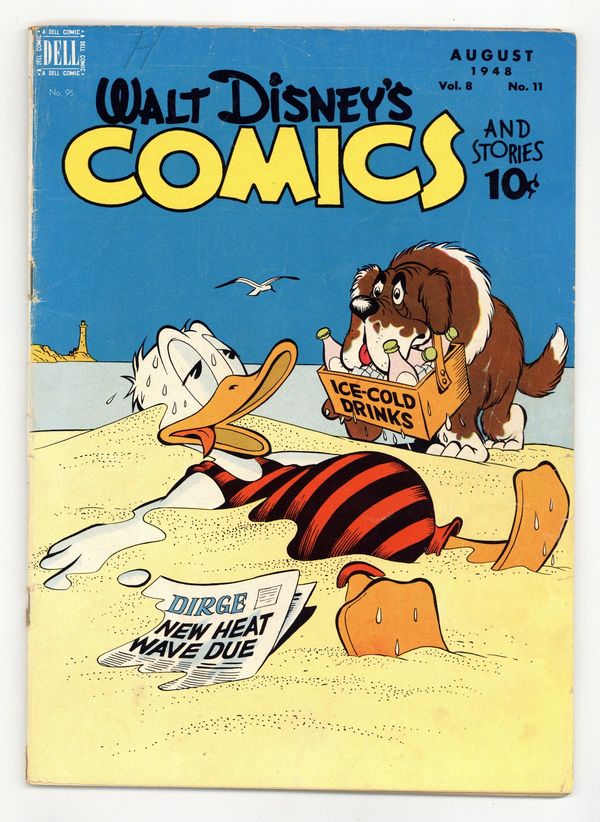 Tags: Disney Ducks & MicePublished Aug 1948 by Dell/Gold Key.$24.00Cover by Carl Barks. Stories and art by Carl Barks, Floyd Gottfredson, Bill Walsh, Dick Moores, Bob Karp, Hubie Karp, Ralph Heimdahl, Harvey Eisenberg, Gil Turner, George Waiss, Bill Wright, and Al Taliaferro. Sometimes listed as Vol. 8 #11. The long-running vehicle for Disney character comics featured work by Carl Barks, Floyd Gottfredson, and Pogo's Walt Kelly. In a classic story from the Mickey Mouse comic strip, Mickey hosts Minnie's demanding aunt Marissa, who unexpectedly takes a liking to Goofy. In a story by Barks, Donald and Gladstone talk themselves into a fund-raising race for Daisy's club. Bootle Beetle reveals his life story to Bucky Bug. Donald Duck; Bucky Bug; Li'l Bad Wolf; Mickey Mouse; The Trial of Donald Duck; Three for Breakfast; Mickeys "Safe and Sane" Fourth; Mickey Mouse and Aunt Marissa. 48 pages, Full Color. Cover price $0.10.