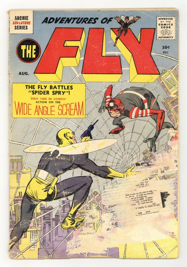 This series is titled "Adventures of the Fly" from issue 1 to issue 30. Edited by John Goldwater. Cover by Joe Simon and Jack Kirby. Stories by Joe Simon, Jack Kirby, George Tuska, and Bill Draut. Archie Comics amiable and agile super-hero The Fly battles an assortment of nefarious villains, including arch foe Spider Spry. Includes origin story. Includes an adventure starring The Shield as well. 36 pages, full color. $0.10. Cover price $0.10.