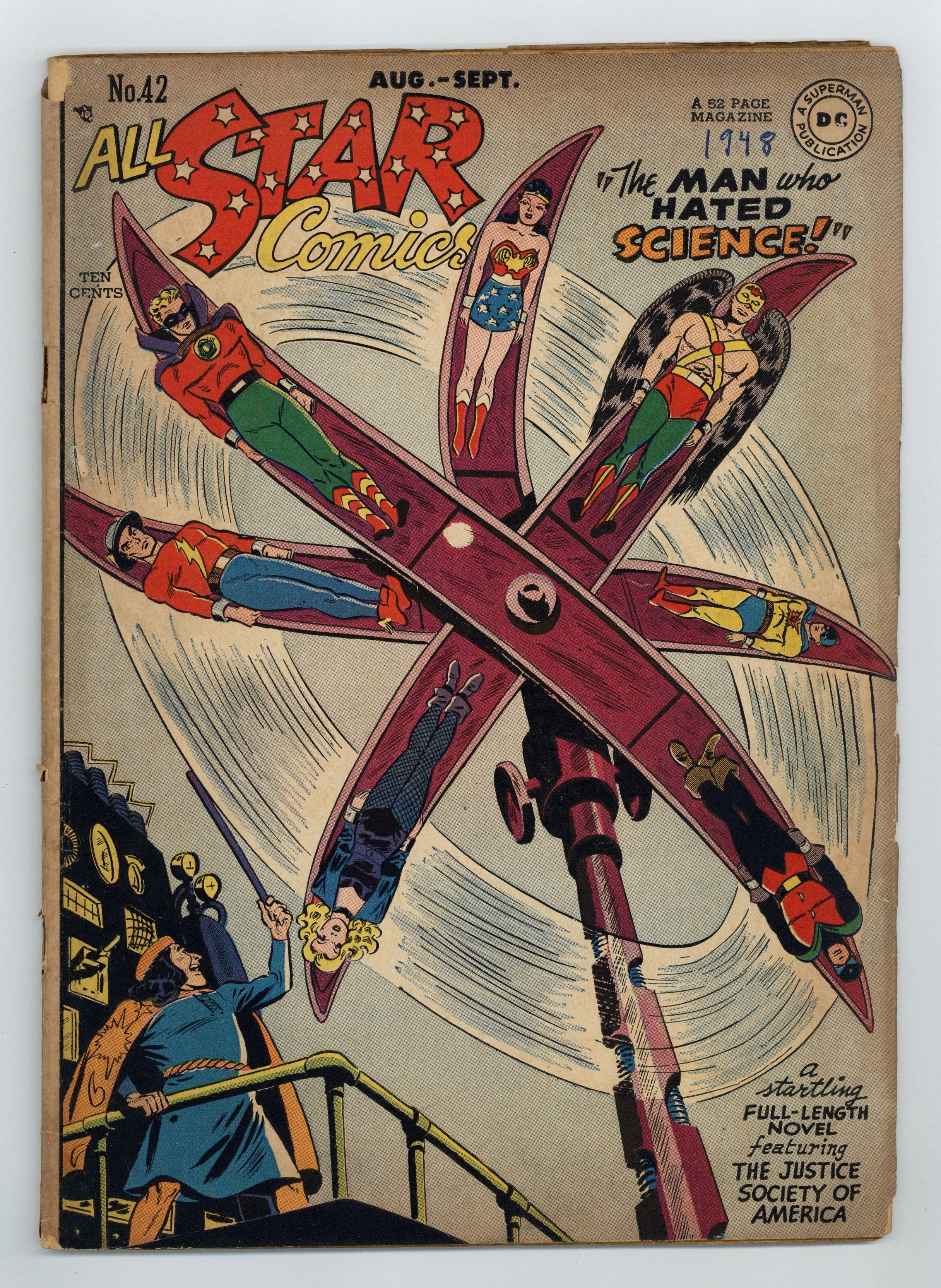 The Justice Society of America battles "The Man Who Hated Science!" The Atom and Hawkman don new costumes. Script by John Broome, pencils by Arthur Peddy, inks by Berhard Sachs. Back-up story, "Johnny Peril's Surprise Story!" Two-page text story, "Descent Into Wonderland." Irwin Hasen cover. 52 Pages, Full Color. Cover price $0.10.