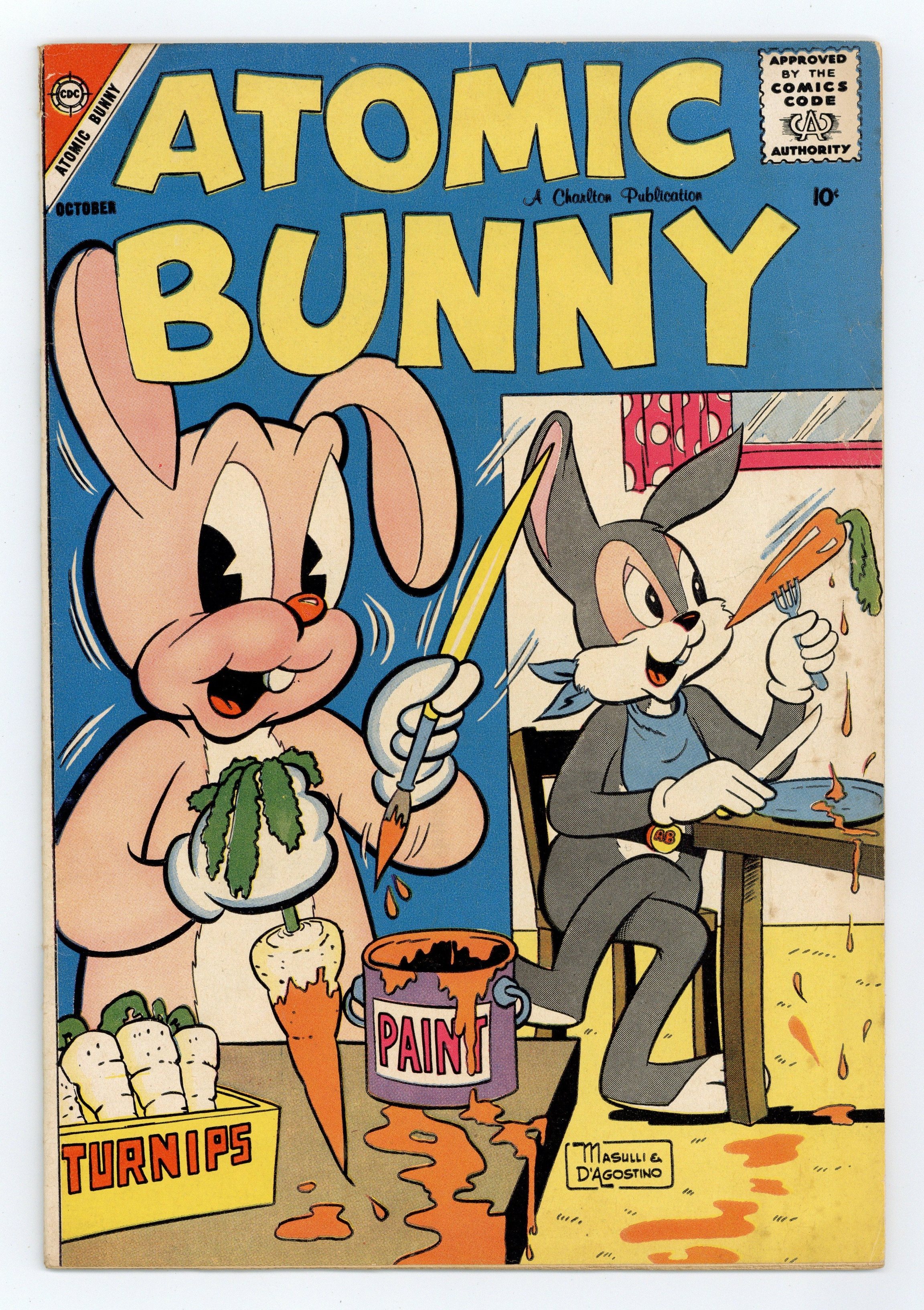 Masulli-D'Agostino cover features a Bugs Bunny look-alike instead of Atomic Bunny. "Atomic Bunny, Hunt a Tail!" features Atomic Rabbit instead of Atomic Bunny; Atomic Rabbit's chest initials have been modified to state "AB" instead of "AR". In order of appearance: "Atomic Bunny, I'll Top That!" and "Atomic Bunny Went A-Courting" art by George Wildman; "Eddie Extra, Extra-Special Selling"; and "Atomic Bunny, Hunt a Tail". "Captain Corey's Curiosity Corner, Things to Make, Things to Know, Things to Do: Swimming All Year Round, Dahlias, Killies in the Tank" text article. 36 pages. Full color. Cover price $0.10.