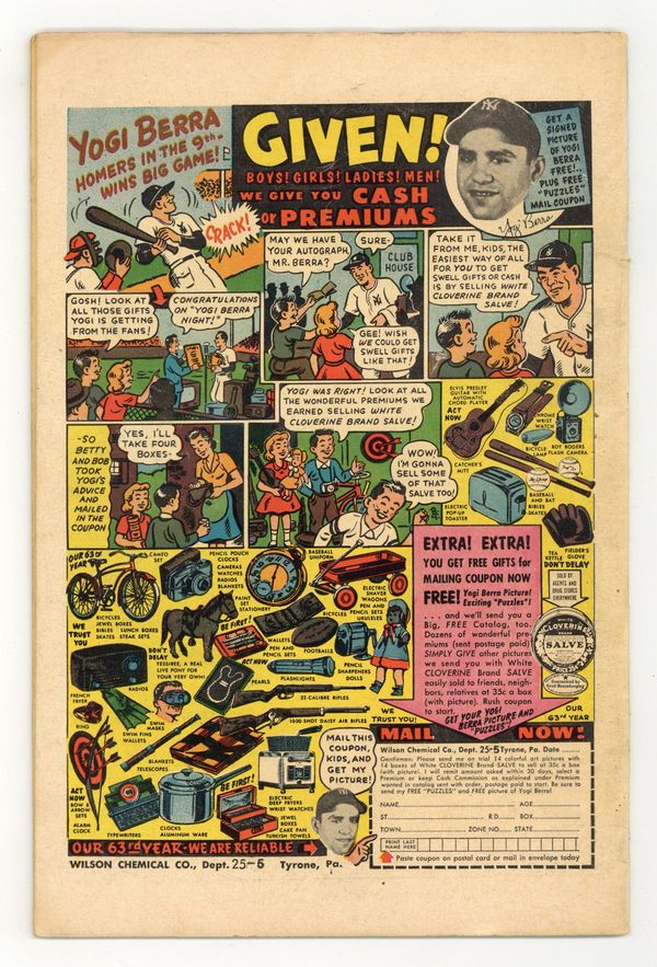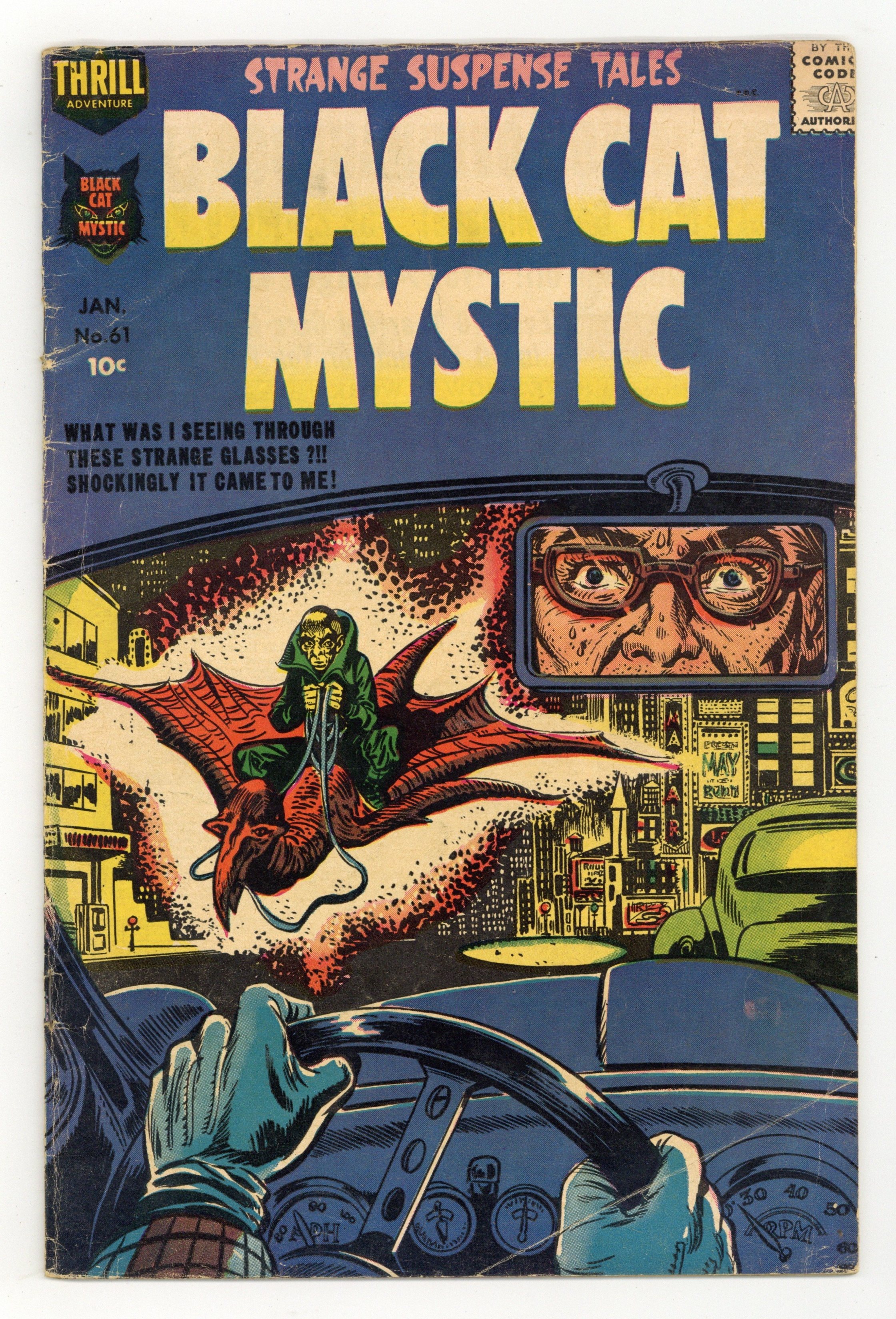 $75.00Stories and art by Bob Powell, Howard Nostrand, and Joe Certa. As the Comics Code goes into effect, former horror comic Black Cat Mystery becomes kid-friendly Black Cat Mystic. This issue features stories from Black Cat #45, altered to comply with the Comics Code. A man hypersensitive to color is driven to murder for a cure, in a creative, oft-reprinted story. A boxer regains his confidence in the ring after drinking a mysterious potion. Also, superstitions about birds and animals from around the primitive world. Colorama; Lynch Mob; Knockout; I.O.U. One Body. 36 pages, full color. Cover price $0.10.