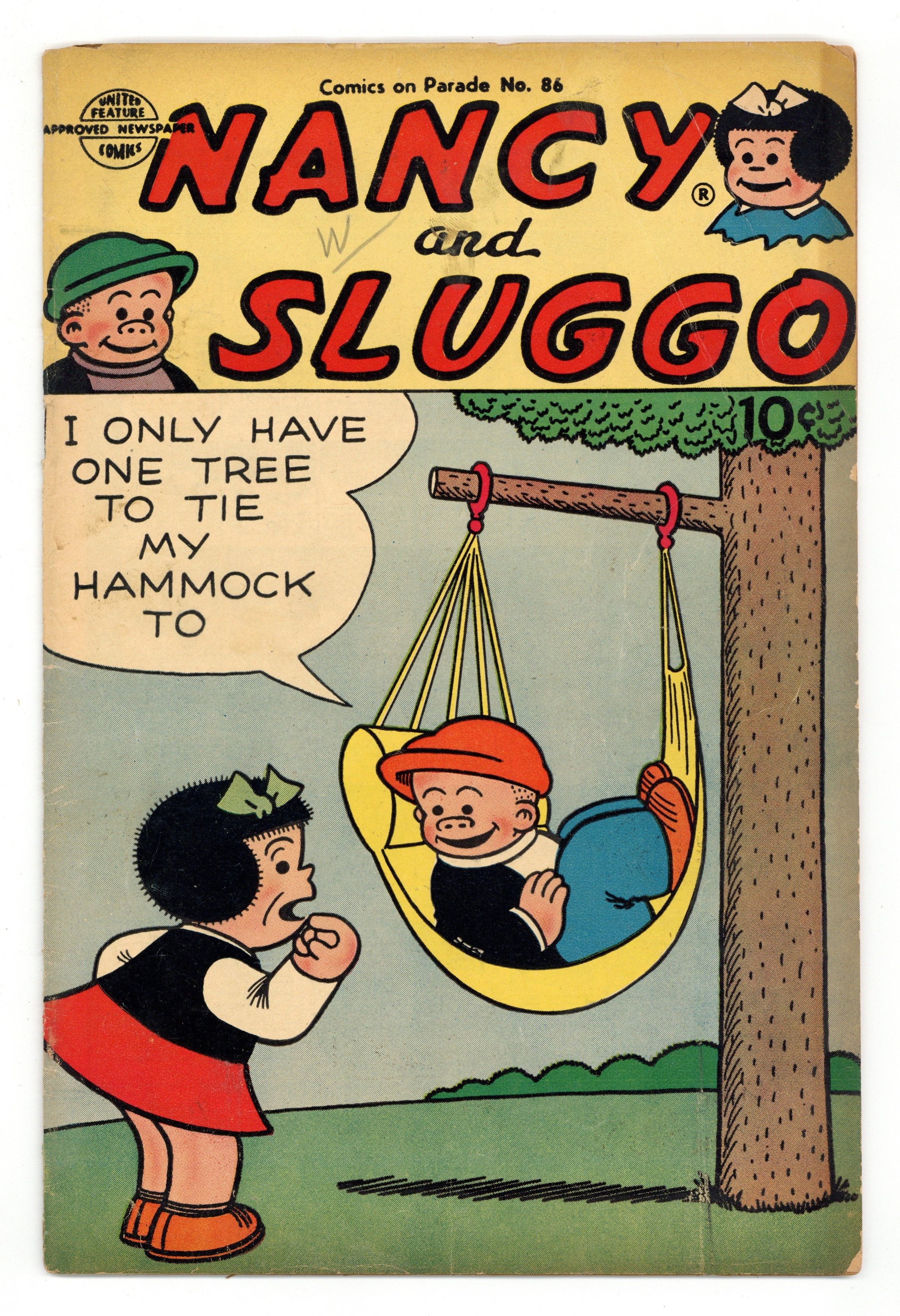 Cover by Ernie Bushmiller. Stories and art by Ernie Bushmiller and others. Comics on Parade features reprints of Ernie Bushmiller's popular Nancy strip, featuring precocious Nancy and her streetwise pal Sluggo. Sluggo's hotcakes are selling like... hotcakes. Nancy goes on vacation to her uncle's farm. Her uncle claims he has the smartest bird-dog in the world. Nancy; Stamp Tips. 32 pages, Full Color. Cover price $0.10.