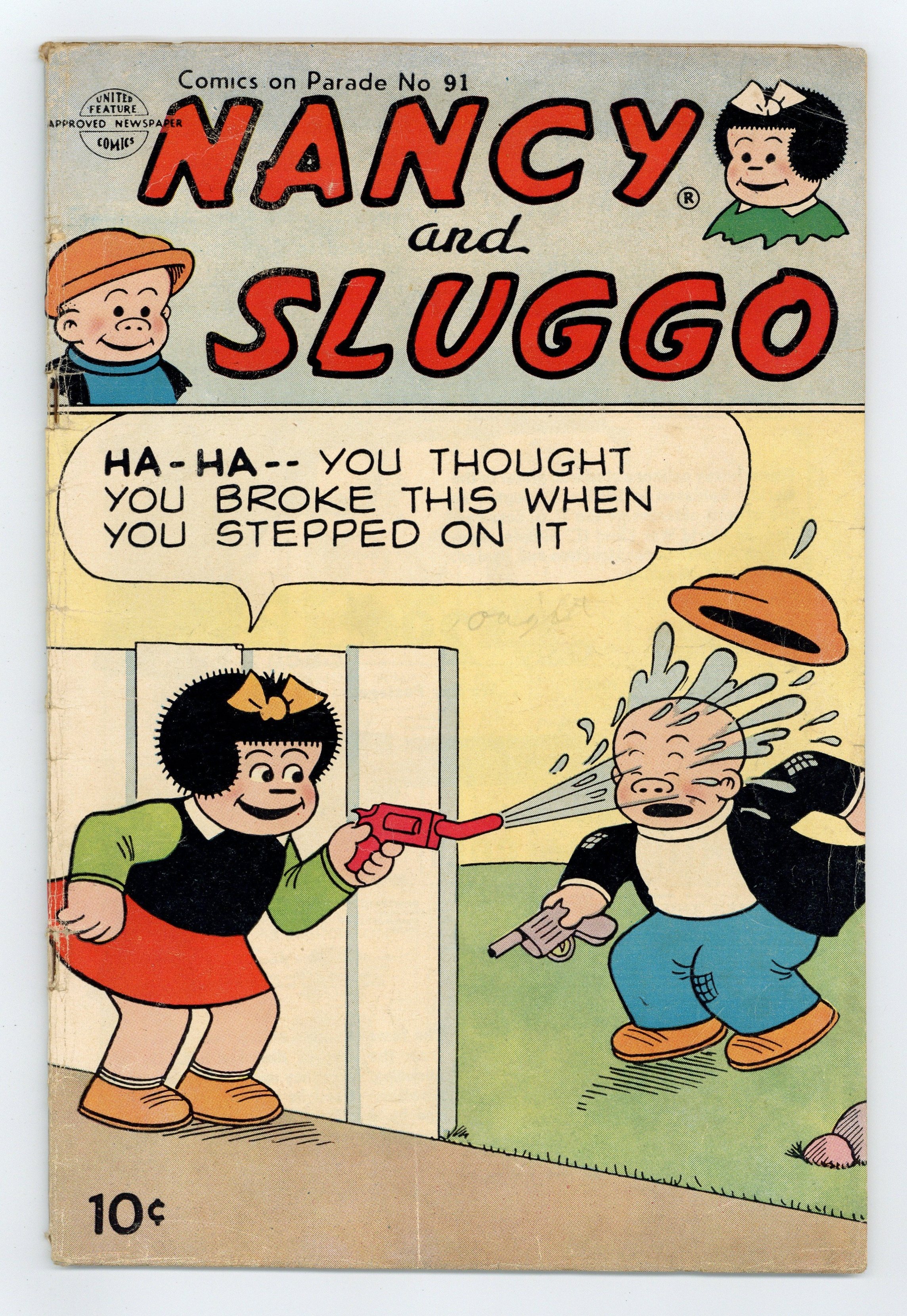 Cover by Ernie Bushmiller. Stories and art by Ernie Bushmiller and Ed Dodd. Comics on Parade features reprints of Ernie Bushmiller's popular Nancy strip, featuring precocious Nancy and her streetwise pal Sluggo. Nancy gets invited to a costume party. Sluggo and Nancy go to the beach. Nancy visits her uncle's farm. Nancy; Stamp Tips; Back Home Again. 32 pages, Full Color. Cover price $0.10.
