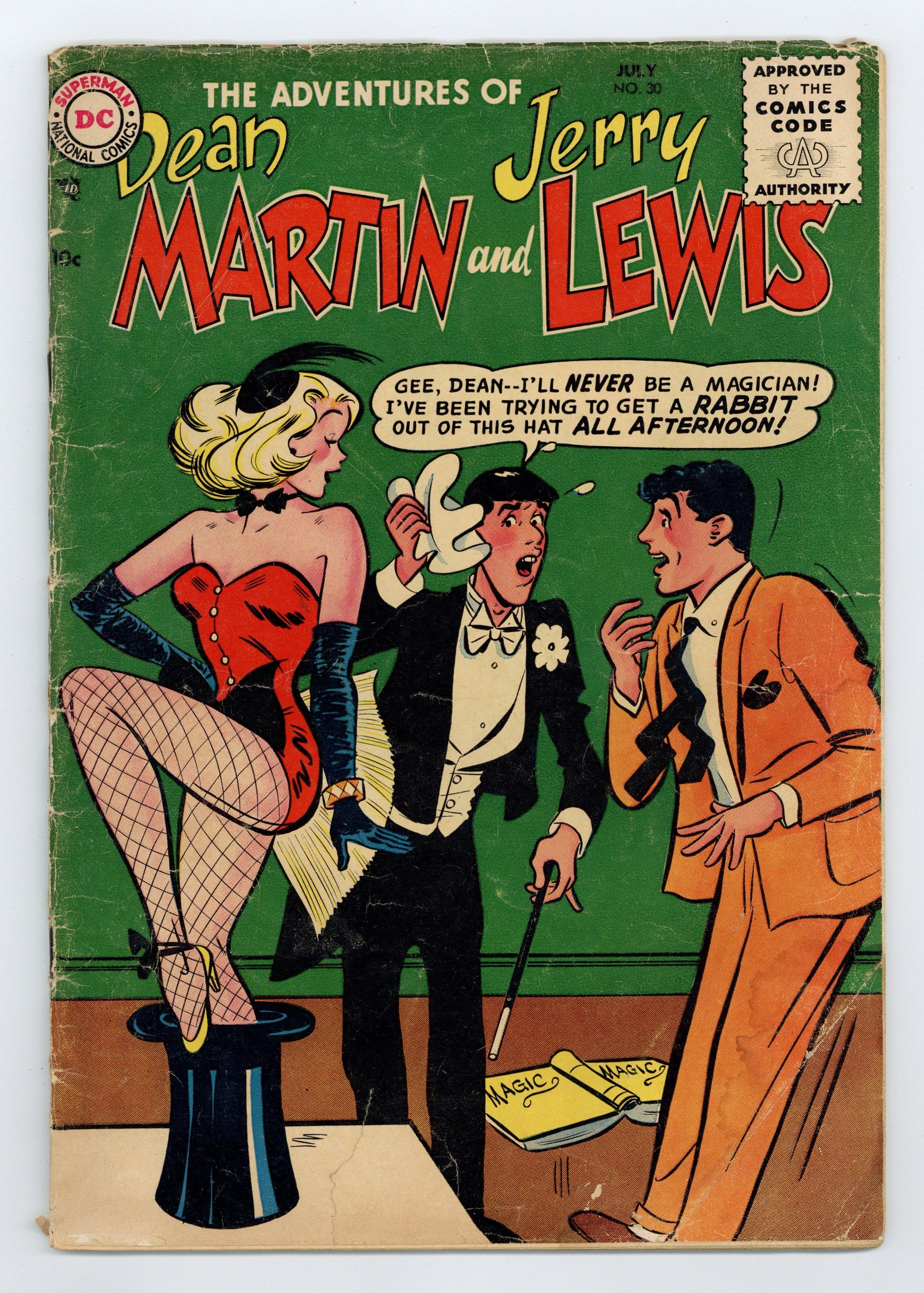 Written by Cal Howard. Art and Cover by Owen Fitzgerald. Dean Martin and Jerry Lewis star in a 3-part untitled magician's tale! Plus: Broadway Ha-Lights untitled reprint 1-pager by Harry Lampert; Varsity Vic untitled reprint 2-pager by Henry Boltinoff; and Betty untitled half-pager. 32 pages, full color. Cover price $0.10.