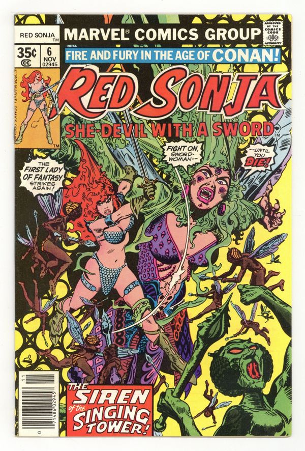 First 35-cent cover-price. "The Singing Tower." Script by Roy Thomas and Wendy Pini (of Elfquest fame), plot by Clara Noto, art and cover by Frank Thorne. Spider-Man stars in a one-page Hostess ad, "Legal Eagle." Cover price $0.35.