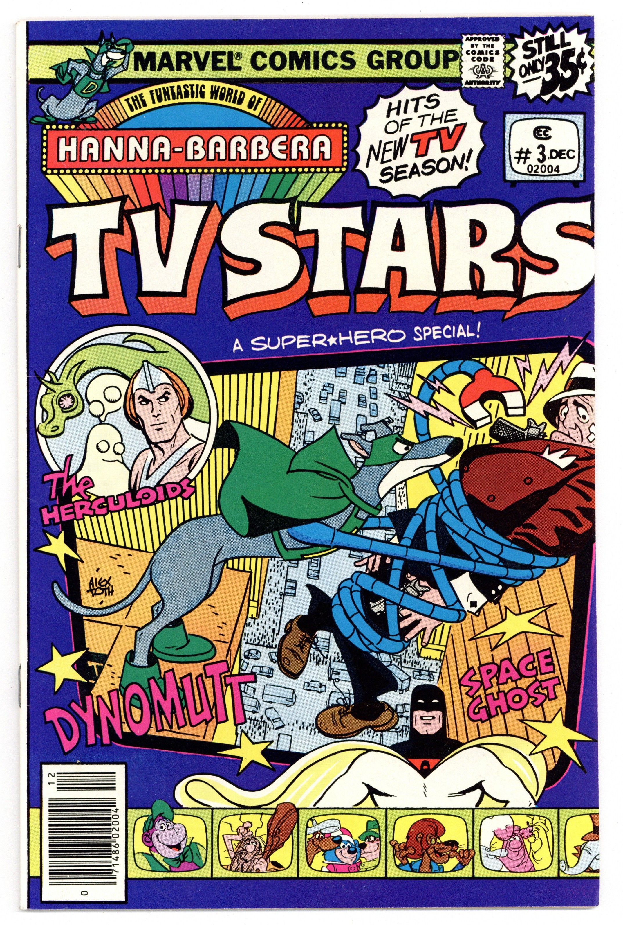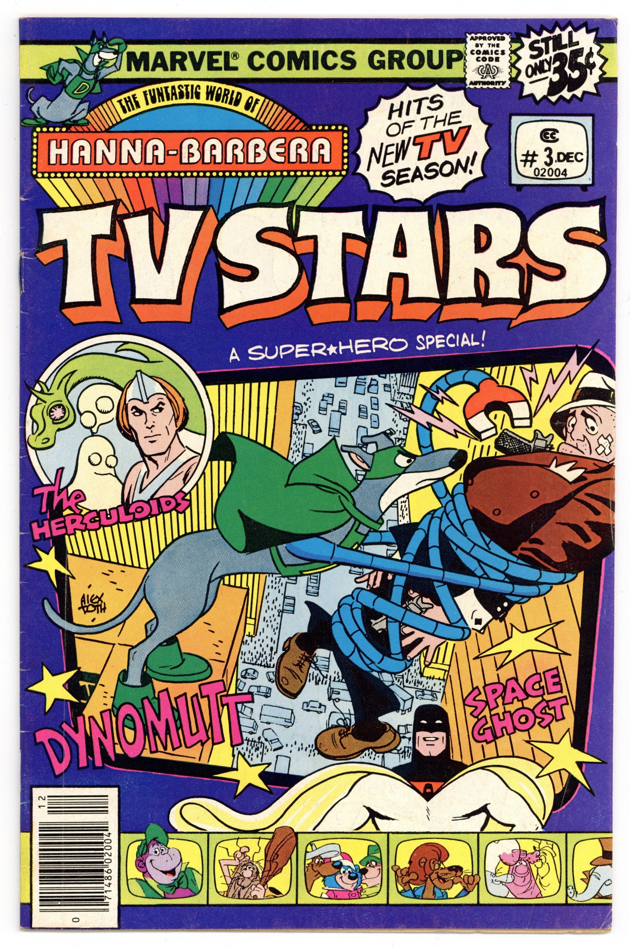 Cover art by Alex Toth. "The Gingerbread Man," script by Mark Evanier, art by Paul Norris; Timid Abner Bakerman, attempting to bake the biggest gingerbread man in history, unknowingly uses radiated flour; and the creature comes to life! "Cauldron of Disaster," script by Mark Evanier, pencils by Will Meugniot, inks by Dave Stevens; A prehistoric family and a group of superpowered beasts try to protect their planet from alien invaders. The Funtastic World of Hanna-Barbera article; Dynomutt tells readers more about Space Ghost and the Herculoids. "Pilgreen's Progress," script by Mark Evanier, art by Alex Toth; While out searching for space pirates, Space Ghost and his crew come upon ... a flying automobile?! 36 pgs., full color. Cover price $0.35.