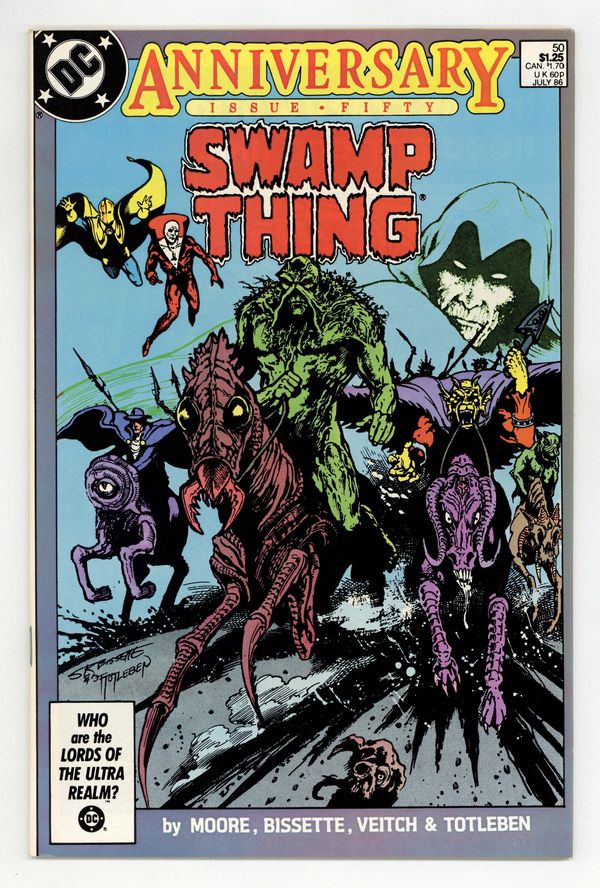 52-page giant Anniversary issue. Cover by Stephen R. Bissette and John Totleben. The End, script by Alan Moore, art by Stephen Bissette, Rick Veitch, John Totleben, and Tom Mandrake; While John Constantine and the mystical heroes of the DC Universe wage a last-ditch effort to hold back the evil of the Brujeria, Swamp Thing, the Demon and others descend into hell itself to battle a horde of demons; includes Phantom Stranger, Spectre, Doctor Fate, and Deadman. 52 pgs., full color. $1.25. Cover price $1.25.