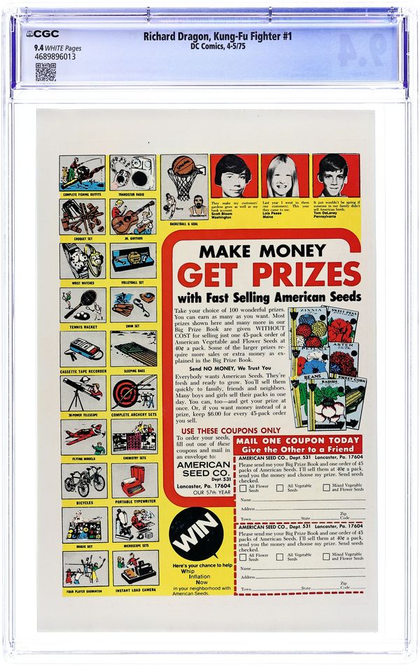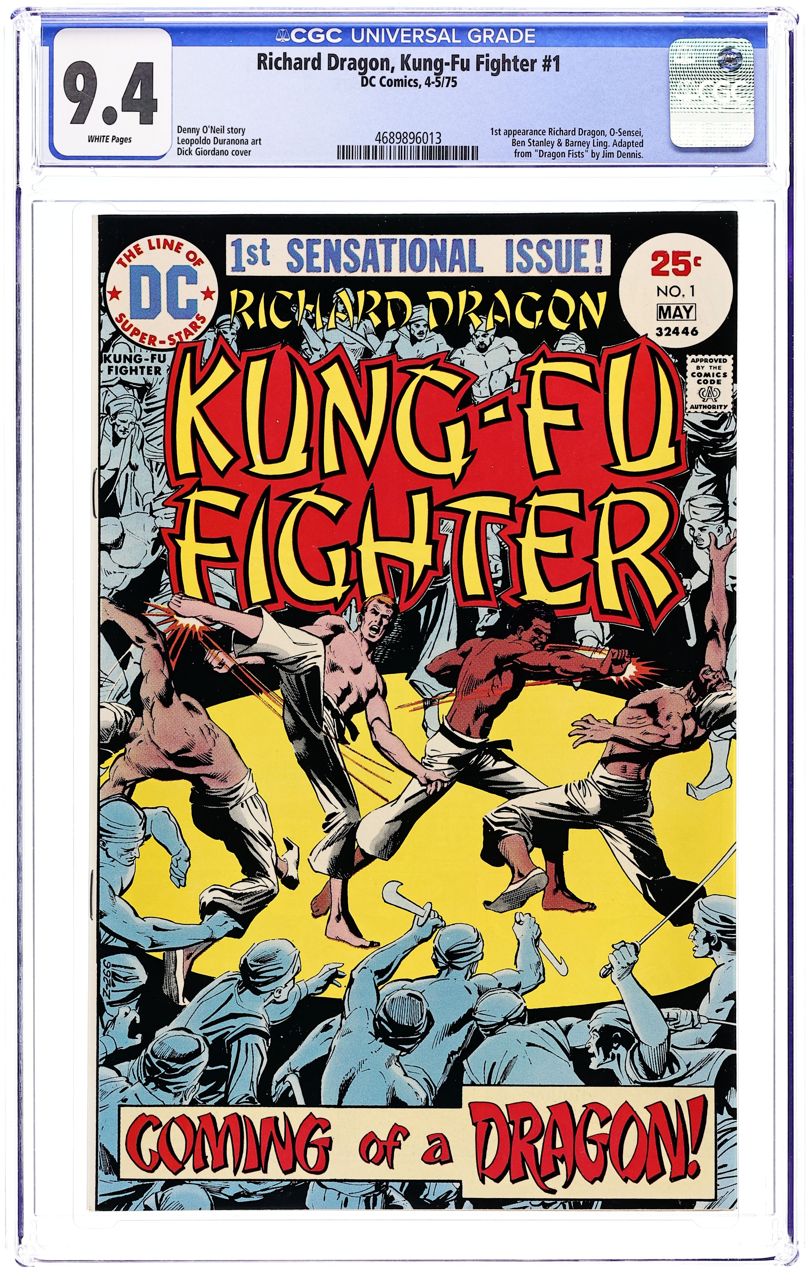 Cover art by Dick Giordano. Coming of a Dragon! starring Richard Dragon, Kung Fu Fighter (1st appearance), O-Sensei, Benjamin Turner (intro, later becomes the Bronze Tiger), script by Jim Dennis, art by Leopoldo Duranona; martial arts action based on the novel, Dragon's Fists. 32 pgs. $0.25. Cover price $0.25.