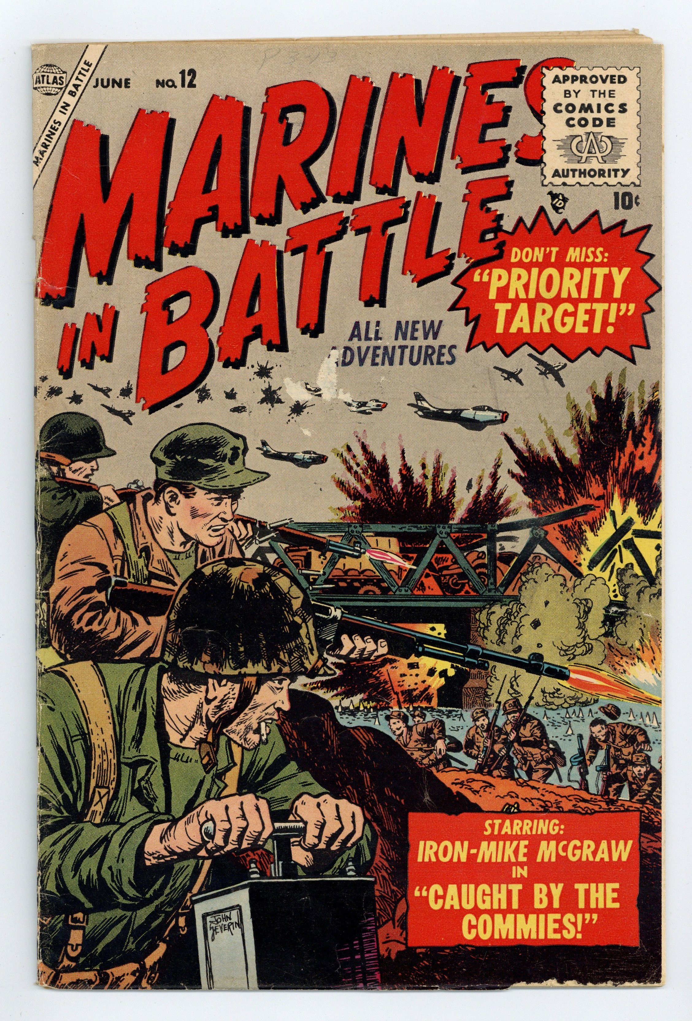 Iron Mike McGraw in "Caught By the Commies" and "Surrounded by the Enemy!" (pencils by Bob Forgione, inks by Jack Abel), "Priority-Target: One Enemy Bridge" (art by Chuck Miller), "Operation Glory," "The Barbary Pirates" (art by Vic Carrabotta), and a two-page text story, "Empire's End." John Severin cover. Cover price $0.10.