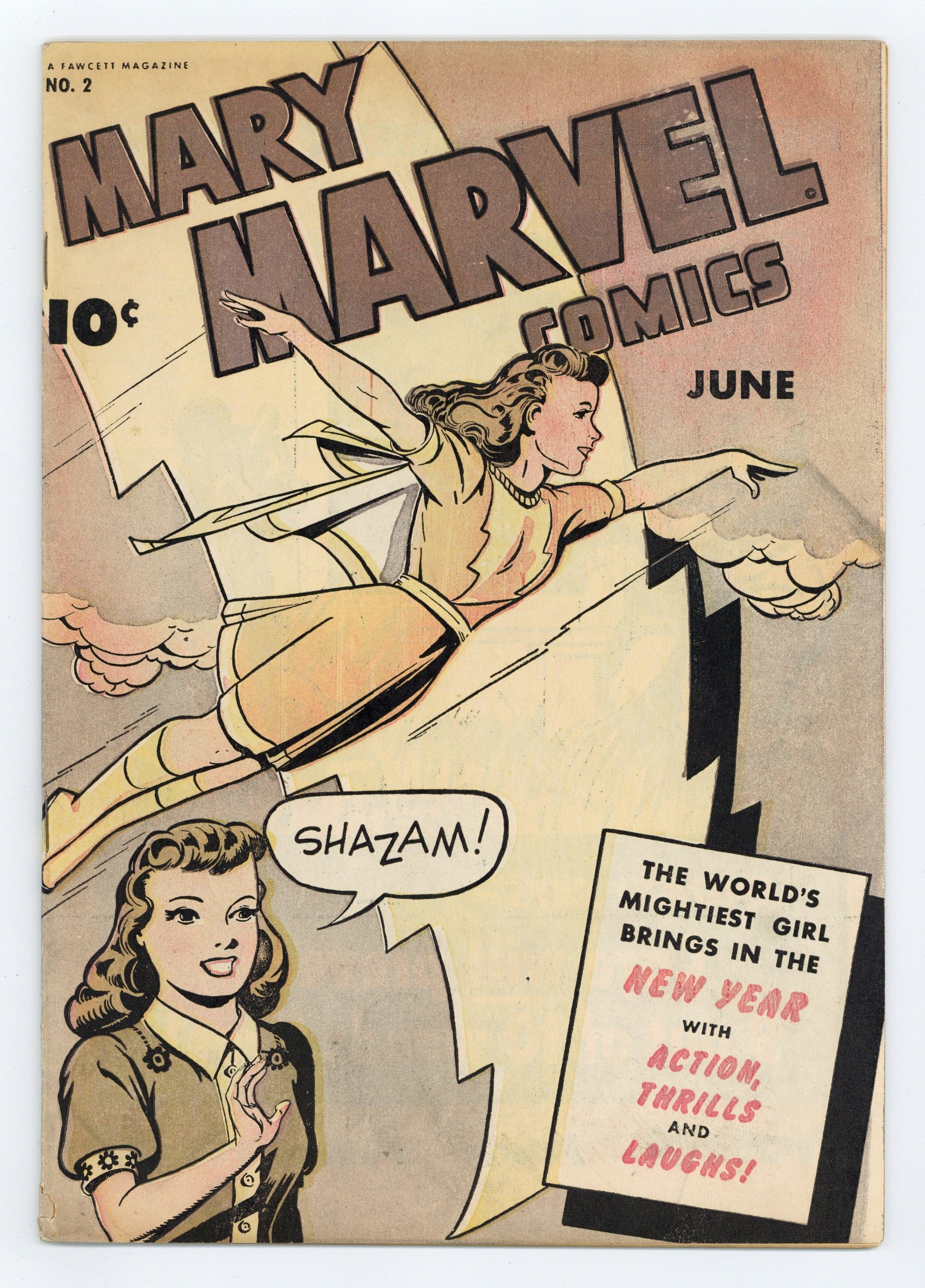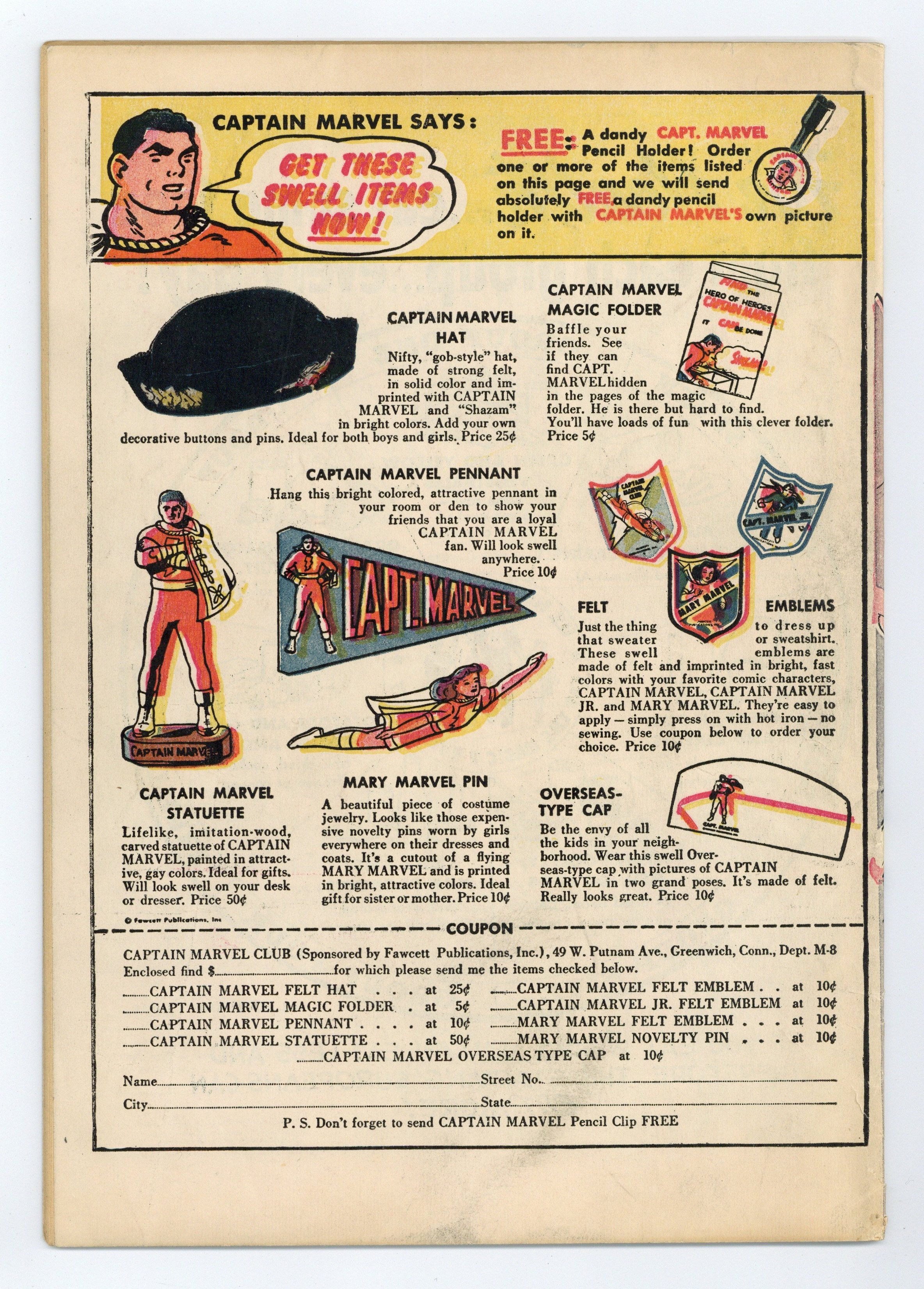 Cover art by Jack Binder. "The Magic Yarn," script by Otto Binder, art by Jack Binder; Mary decides to check up on Georgia Sivana at the reformatory, but learns Georgia has been paroled for good behavior and is now a part of the Women's Knitting Club, who spend their time knitting things for the destitute in Europe; But Mary smells a rat. "The Mississippi Marauders," art by Jack Binder. "The Heart of a Fisherman" text story by Walta K. Ross. "Curse of the Books!", script by Otto Binder, art by Jack Binder; A rare book auctioneer has to sell his valuable books, but he wants the money and the books, so he scares his victims by wearing weird disguises in order to steal back his collection from the high bidders. "The Mad Poet," script by Otto Binder, art by Jack Binder; Mary Marvel vs. The Mad Poet. 36 Pages, Full Color. Cover price $0.10.