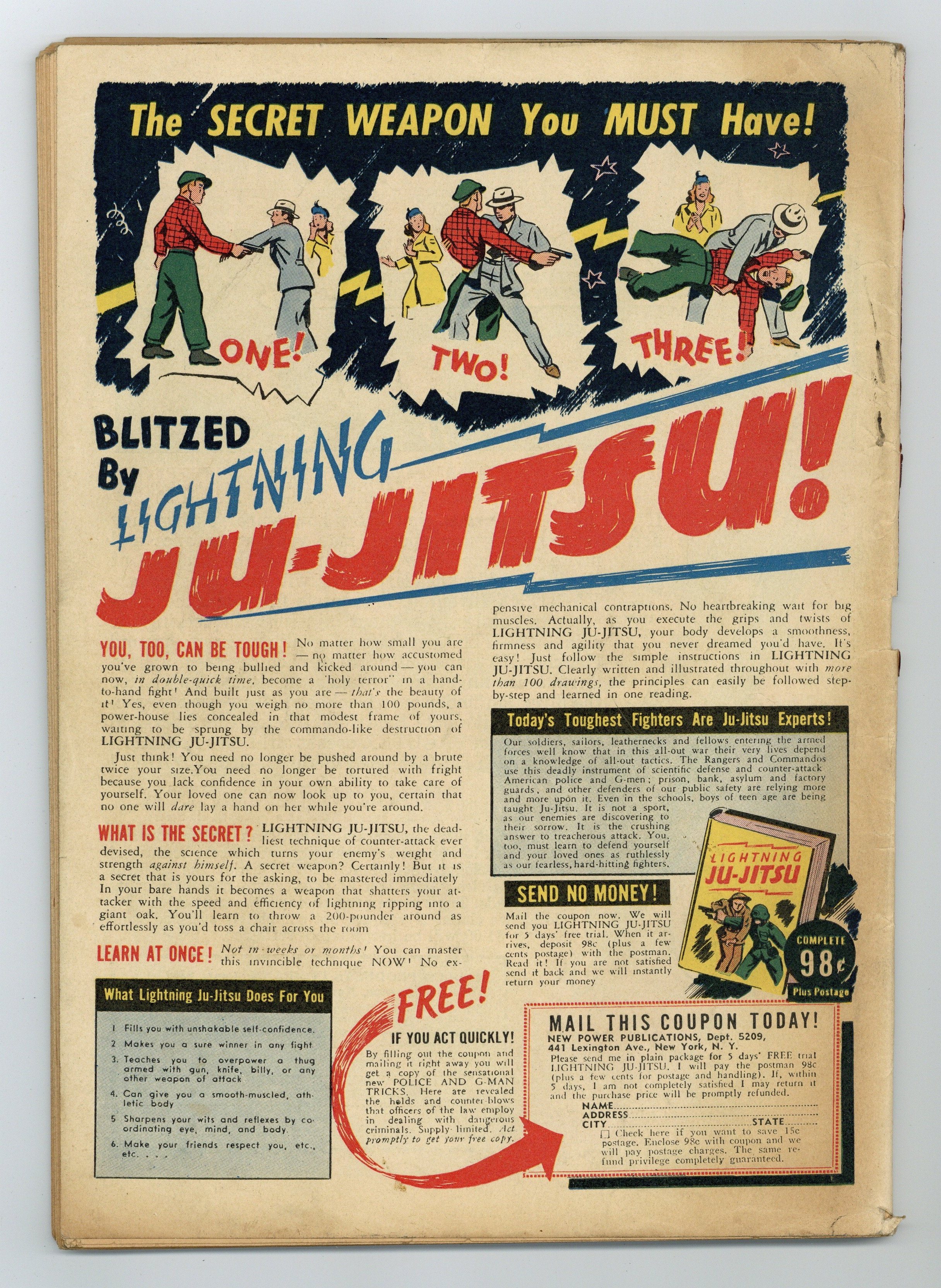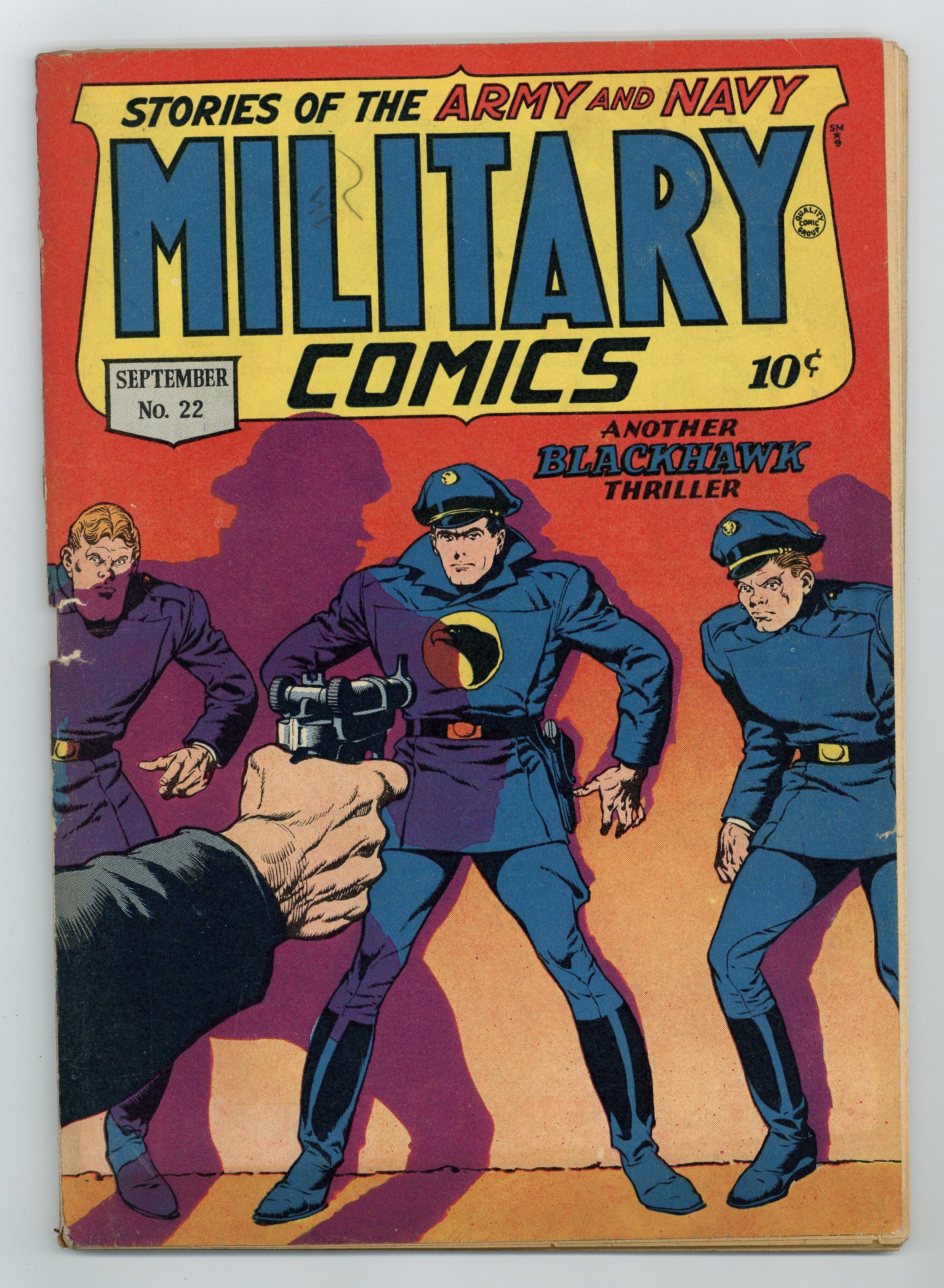Cover art by Alex Kotzky. Suspicion starring Blackhawk, art by Reed Crandall. Untitled stories starring Private Dog Tag (script and art by Bart Tumey), Sniper (script by Ted Udall, art by Vernon Henkel), Death Patrol (script and art by Al Stahl), and Sailor Danny (pencils by Sid Lazarus, inks by Robin King). Moby Dick Doesn't Like Japs featuring P.T. Boat. Barney Ross's Greatest Fight featuring Secret War, script and art by Fred Guardineer. 68 pgs. $0.10. Cover price $0.10.
