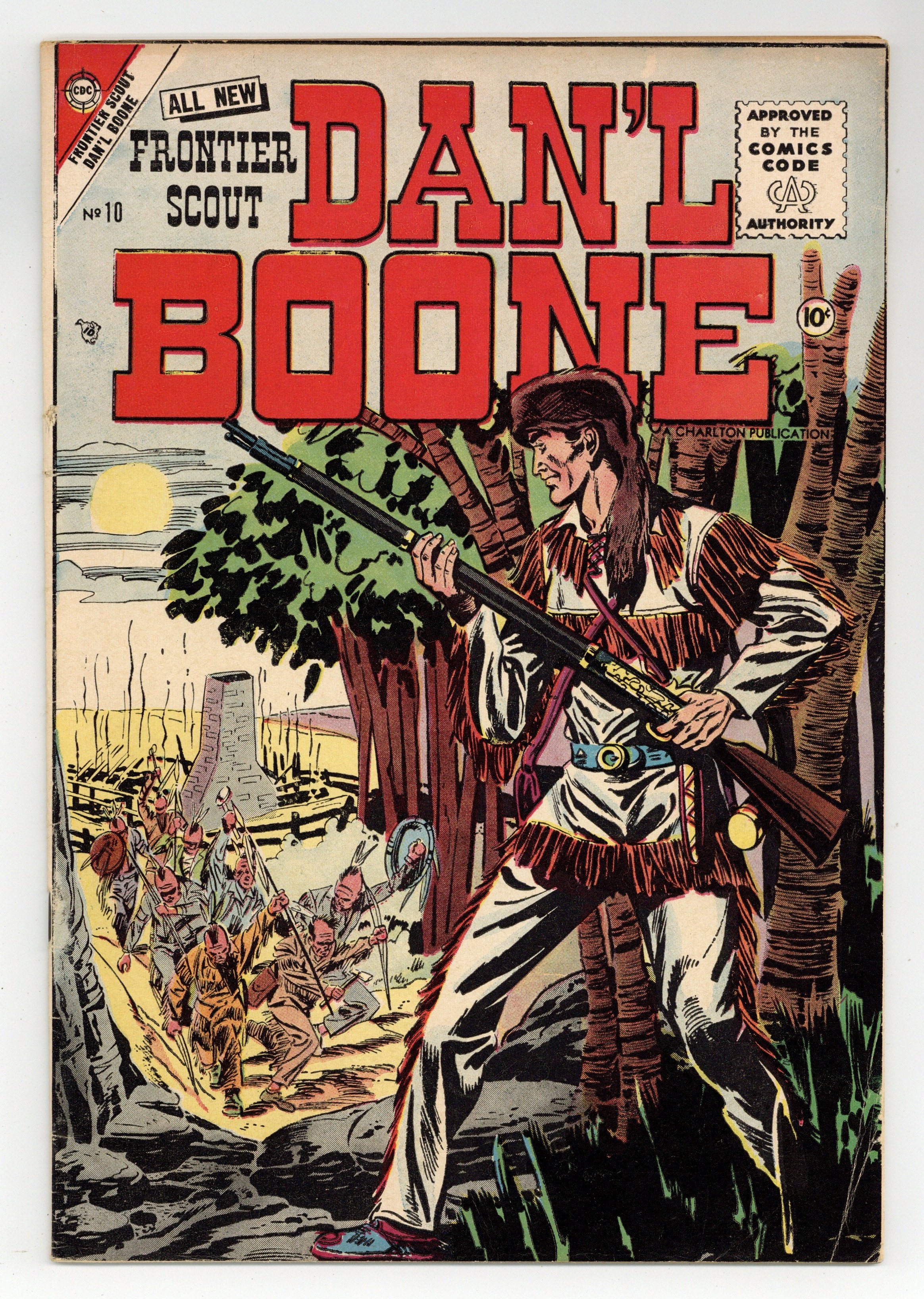 Cover by Vince Alascia. Stories and art by Stan Campbell and Frank Bolle. Numbering continues from Death Valley (1955 Charlton) #9. Tales of the legendary frontiersman. Trapper Kentucky Jack seeks Daniel Boone's help in dealing with Cherokee marauders, but Boone soon realizes that they only want the furs Jack stole from them in the first place. Captured by the Pawnee, Daniel Boone is forced to use his hunting skills to help them survive a famine, gradually becoming one of the tribe but also making a powerful enemy. Daniel Boone saves Miss Vance from a Cherokee advance, but then they must warn the nearby town. The Rifled Cache; Winter Famine; Odds on Death; Dangerous River; Death Valley; Sgt. Bart Norton: Warpath. 32 pages, Full Color. Cover price $0.10.