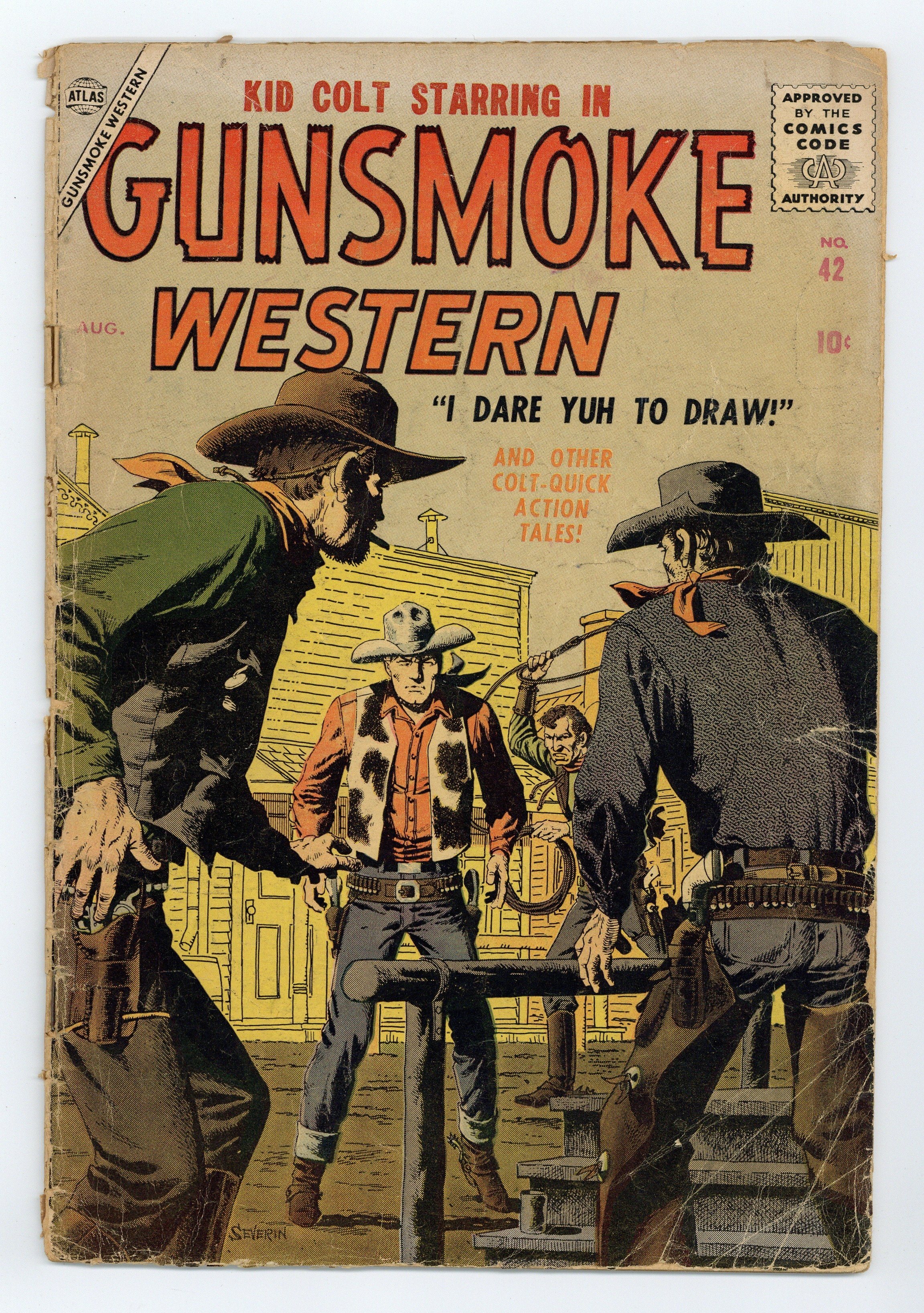 Cover by John Severin. Stories by unknown. Art by Jack Keller, Doug Wildey, Frank Bolle, Jimmy Infantino and Gene Colan. Featuring Kid Colt in "The Gunhawks of Terror Street!" with art by Jack Keller. Other colt-quick action tales in this issue: "I Dare Yuh to Draw!" with art by Doug Wildey; "Last Stop: Boot Hill!" with art by Frank Bolle; "Five-Pointed Star!" with art by Jimmy Infantino; "The Night the Bartons Rode!" with art by Gene Colan; and 2-page text story "Fearless Mustang," reprinted (and retitled) from Wyatt Earp (1955 Atlas/Marvel) #6. 32 pages, full color. Cover price $0.10.