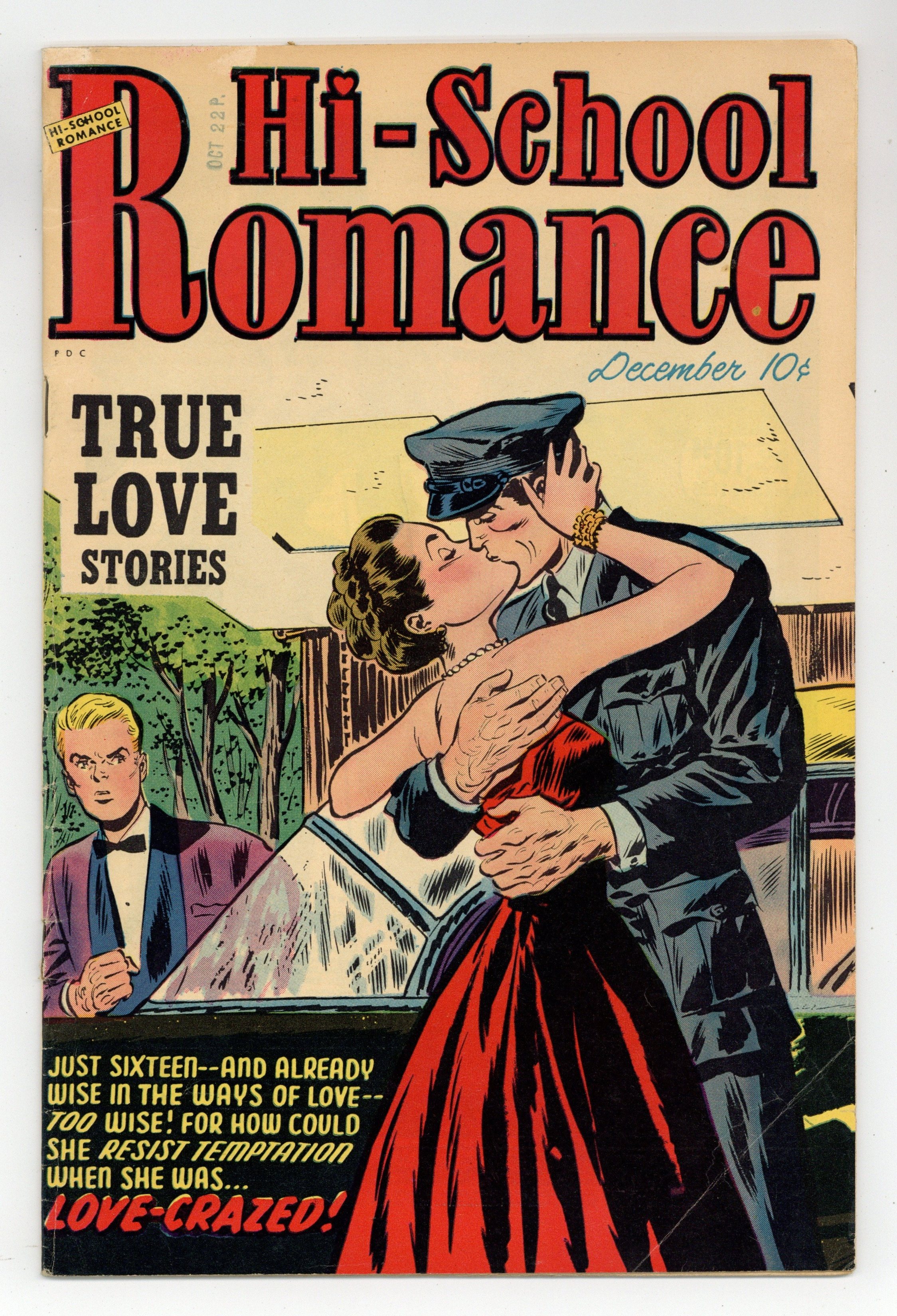 Cover by Lee Elias. Stories and art by Bob Powell, Tom Hickey and Lee Elias. A romance comic from Harvey, as the teens of the 1950s explore the new world of dating. Toni is torn between possessive chauffeur Vic and his unsuspecting boss, Phil. "Bathing beauty" contest winner Janice dates pushy Nick, who sullies her reputation with late-night dates and reckless driving. Norma hopes a school counsel election will get her close to longtime crush Jack, but never expects to win the attention of class president Tommy. Love-Crazed; Violent Passion; Bitter Interlude; One Wild Night!; It's Too Late Now; Too Young To Kiss! 32 pages, Full Color. Cover price $0.10.