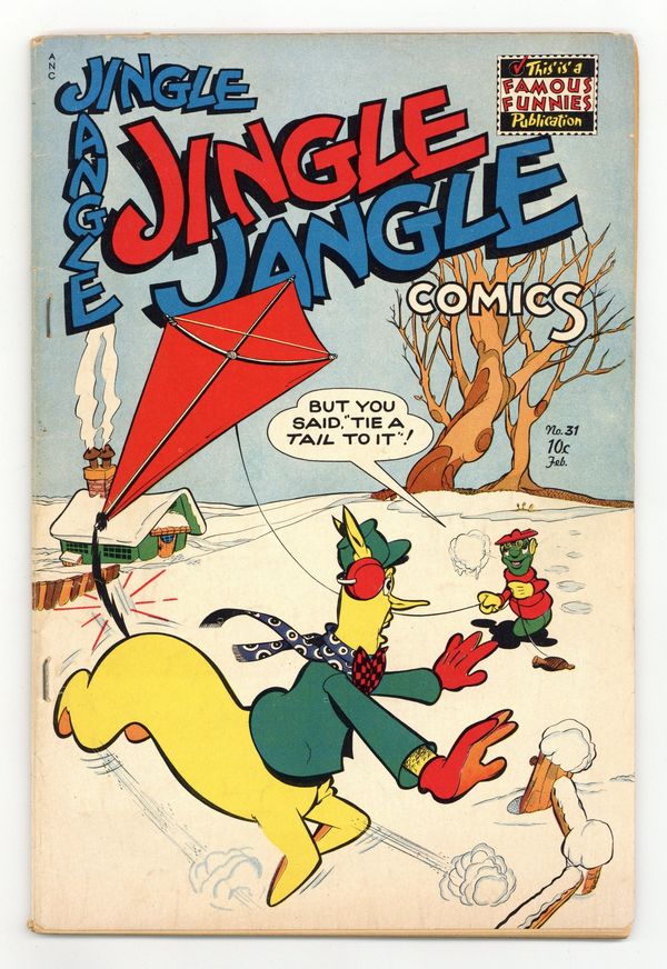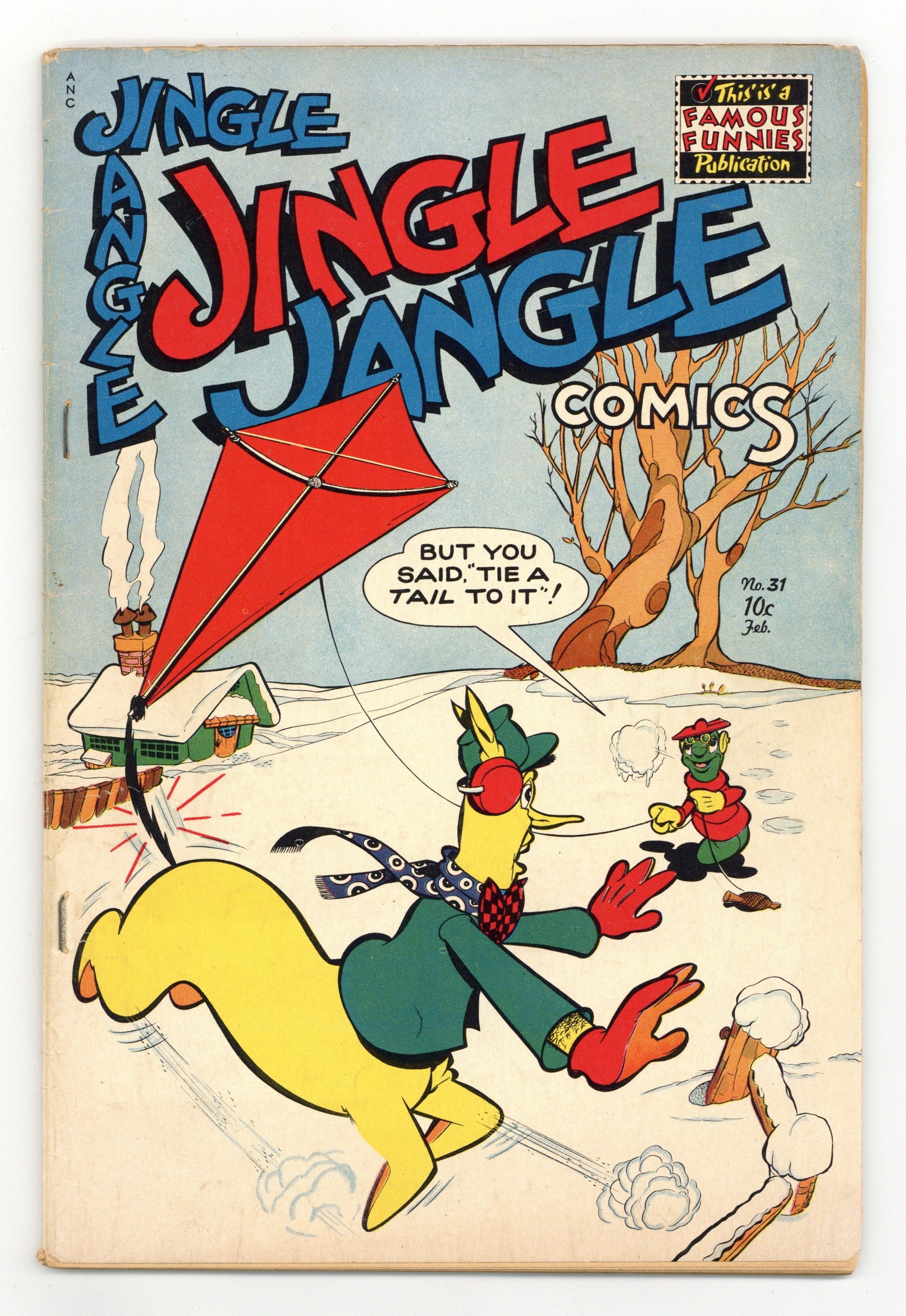 Cover by Allen Ulmer. Stories and art by George Carlson, David Tendlar, Allen Ulmer, Ray Willner, Jack Farr and Larz Bourne. Kids' comics featuring the whimsical fables of beloved artist George Carlson, praised by Harlan Ellison as a "comic of the absurd." King Tooki turns Yollo's magical bed into a dragon ship, but it remains faithful and helps him out of a jam. A runaway gorilla sabotages a birthday cake in The Old Swap Shop. The Green Witch steals the Royal Payroll and escapes in The Pie-Face Prince's new boat, but she can't steer because it has Invisible Oars. Also featuring an ad for a "Mickey Mouse-Donald Duck Weather Forecaster." Bingo and Glum in Fairytale Land; Chauncey Chirp and Johnny Jay; Jingle Jangle Tales: Sleepy Yollo the Bedless Norseman; Topsy Turtle; Let's Get Acquainted; Topsy; Swifty Takes a Wire; The Coo Coo Bird; Hortense the Lovable Brat; Aunty Spry; The Pie-Face Prince of Old Pretzleburg; The Old Swap Shop. 48 pages, Full Color. Cover price $0.10.