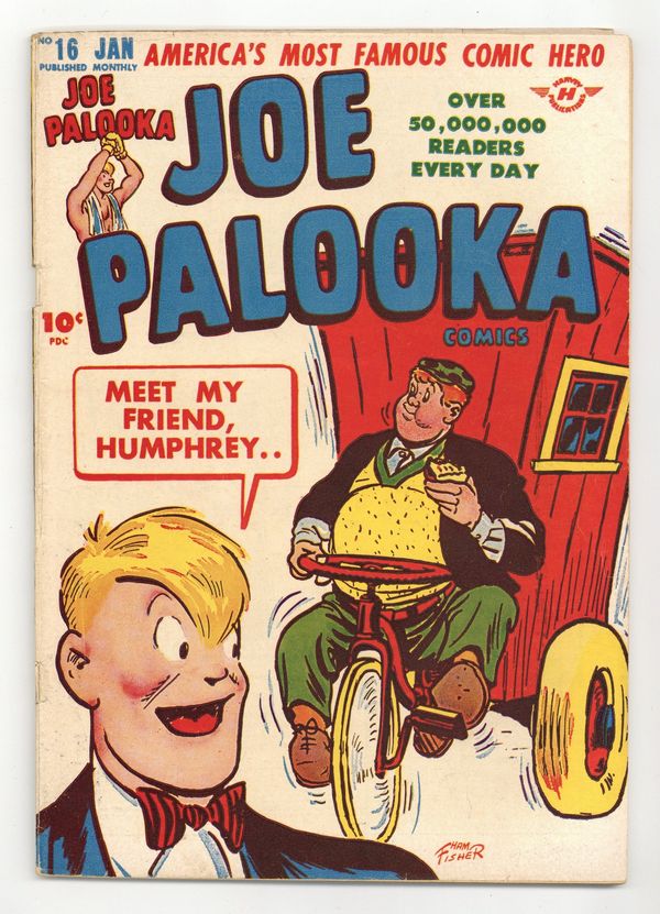 $22.00Cover by Ham Fisher (credited). Stories and art by Ham Fisher, Kirk Stiles, Al Zere, Vic Herman, and Bob Powell. Ham Fisher's comic-strip boxer has adventures both inside and outside the ring. Knobby's latest fighter is Humphrey, a sweetly dumb country bumpkin with super-strength and nigh-invulnerability, but no one is sure what to make of him other than Joe. Flyin' Fools Chickie and Gootch are hired to transport a captive gorilla to Shanghai, but they have to think fast when the primate escapes his cage en route. Plus two prose adventures of early female superhero Black Cat. Joe Palooka; Joes Good Turn; A Party for Joe; Bateese and Balonki Visit New York; Little Max: The Well-Dressed Man; Little Max: Test Pilot; Black Cat: Gun Play; Cartoon Laughs at the Ringside; The Flyin Fool; Ricky Roony; Flossie; Black Cat: Desert Wings. 48 pages, Full Color. Cover price $0.10.
