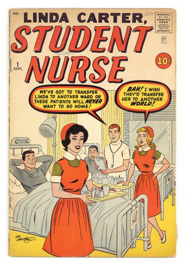 Stories by Stan Lee. Art and Cover by Al Hartley. All the warmth, drama and romance of a nurse's life at a big city hospital! Linda Carter, Student Nurse in: three untitled stories; "Linda's Lovely Fashions" activity page; two untitled 2-pagers; and one untitled 1-pager. Plus: "Good Night, Nurse!" activity page; "Gwen Glitter's Gorgeous Clothes!" activity page; 2-page text story "The Model" (creators unknown); and "Let's Dress the Boys!" activity page. 32 pages, full color. Cover price $0.10.