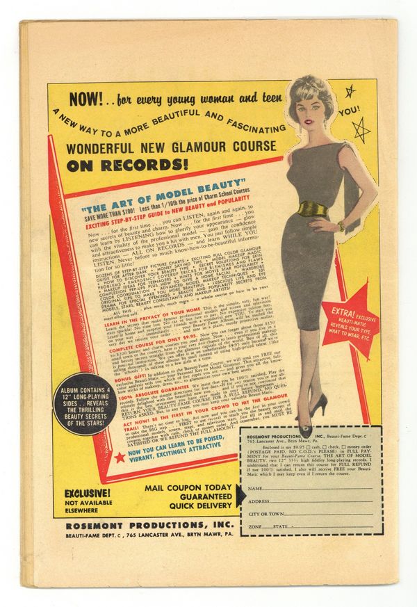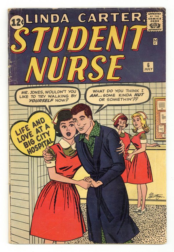 $106.00Cover by Al Hartley. Stories by Stan Lee. Art by Al Hartley, Stan Goldberg, Sol Brodsky and unknown. Life and love at a big city hospital! Linda Carter, Student Nurse in: "Part 1: Heartbreak for Linda" with art by Al Hartley; "Part 2: The Man for Linda" with art by Al Hartley; "Linda's Heavenly Hair Styles" illo with pencils by Stan Goldberg; "Linda's Lovely Fashions" activity page with art by Stan Goldberg and Sol Brodsky; untitled story with art by Al Hartley; and untitled story with pencils by Stan Goldberg. Plus: 2-page text story "My Own True Love" (creators unknown), and "Gwen Glitter's Gorgeous Clothes! The Casual Look" activity page with art by Stan Goldberg and Sol Brodsky. 32 pages, full color. Cover price $0.12.