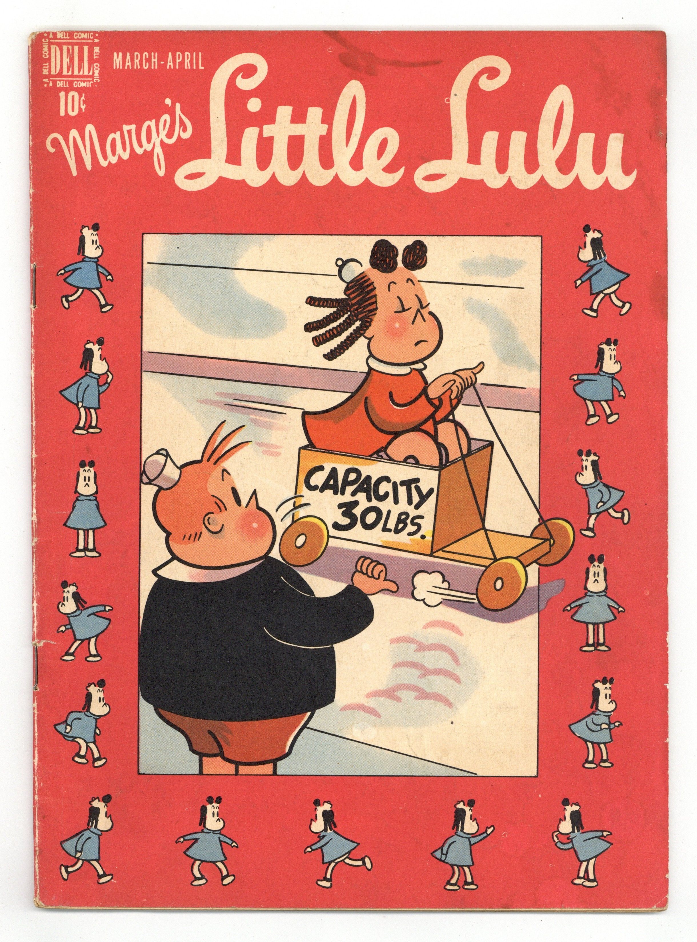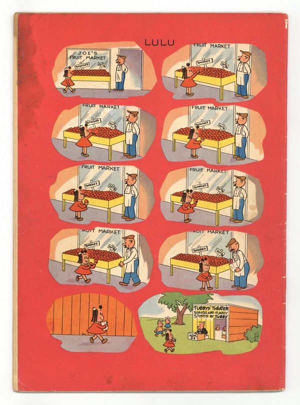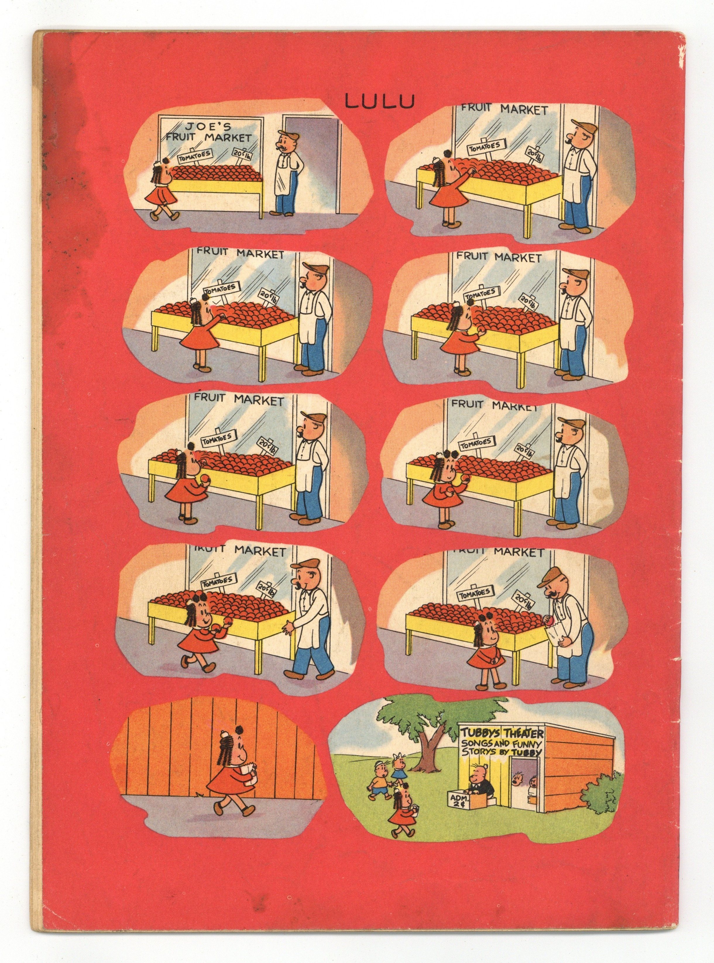 Cover art by John Stanley. A Good Time At the Movies, script and art by John Stanley; Lulu, Tubby, and another girl have just seen a very sad movie. Lulu's Heartthrob, script and art by John Stanley; Tubby becomes jealous when he catches Lulu writing a fan letter to Hollywood. Luluhaha, script and art by John Stanley; Lulu tells Alvin about when she was an Indian maiden. The Report Card, script and art by John Stanley. 36 pages, full color. Cover price $0.10.