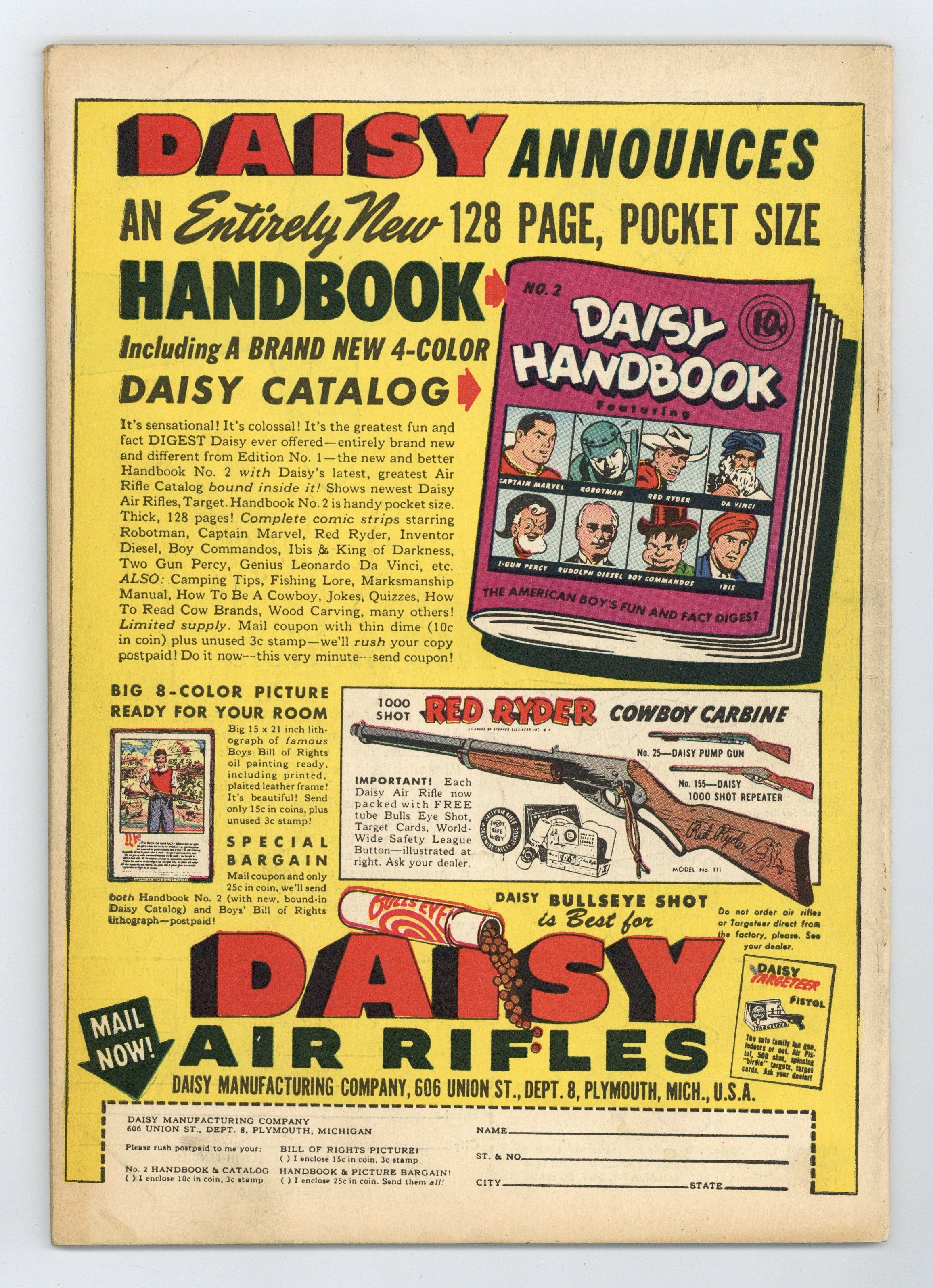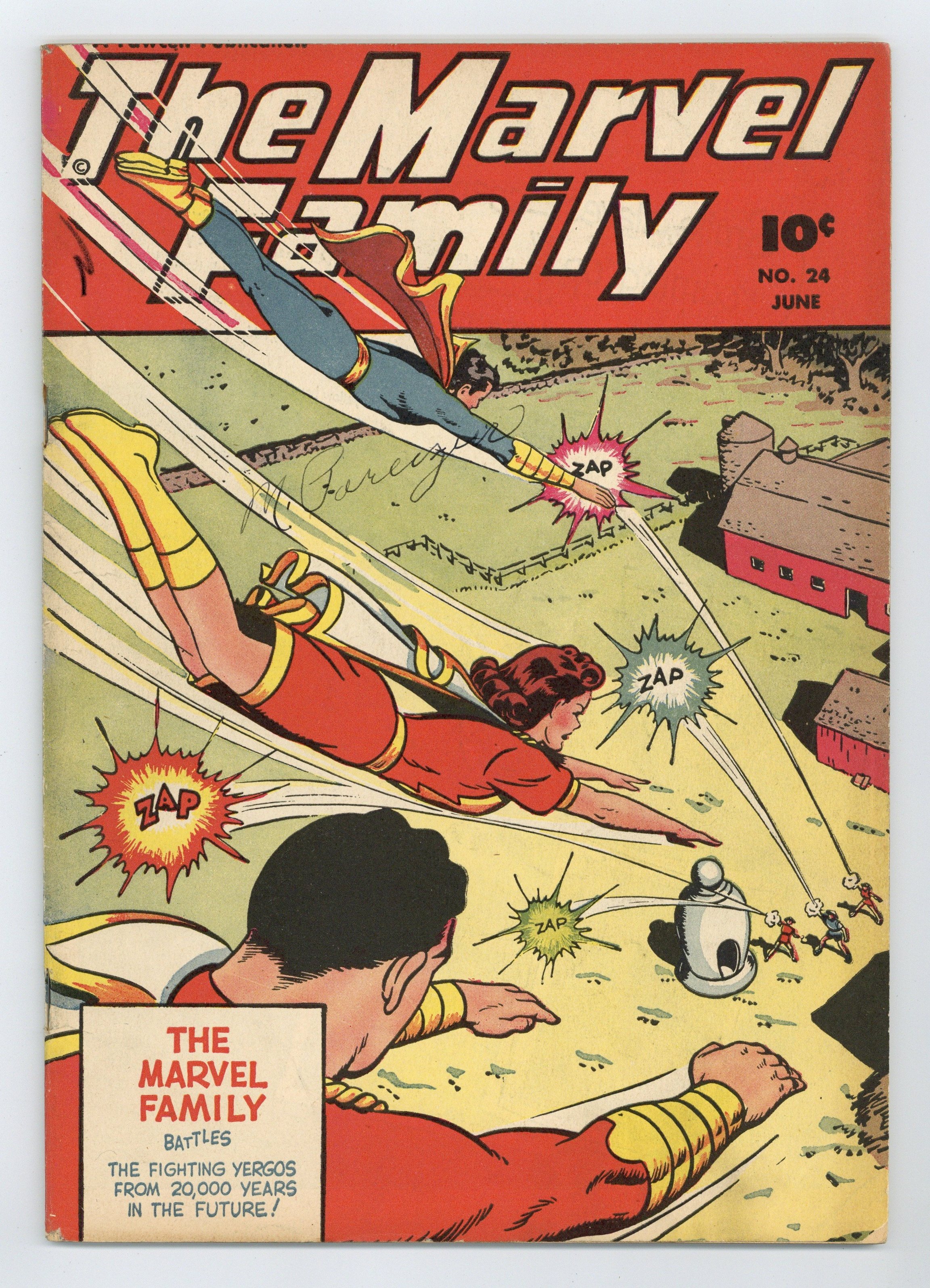 Stories and art by Otto Binder, C. C. Beck, Bill Woolfolk, Joe Certa, Pete Costanza, and Howard Boughner. Fawcett's most popular heroes, the original Captain Marvel (Shazam) and family, in solo and shared adventures. The Marvel Family faces the fighting Yergos, a family of warriors from 20,000 years in the future. Seven-headed Dr. Hydra opens a fourth-dimensional door to Valhalla, unleashing Viking warriors upon the city, but Mary Marvel leads a charge of Valkyries (!) to oppose them. Beautiful enchantress Delilah hypnotizes the original Captain Marvel into believing he's blind. Plus a plethora of vintage comics-format ads, including a Tootsie Roll ad, Captain Tootsie Traps Killer Bear with Invisible Light, with art by Shazam co-creator CC Beck. The Family of the Future; Judge Smudge; Lazy Lee; Benny Beaver and Fuzzy Bear; Boxcar Benny; Captain Marvel Jr.: The Name of Death; Mary Marvel Visits Valhalla; On the Job; Unknown Hero; Captain Marvels Blindness. 48 pages, Full Color. Cover price $0.10.