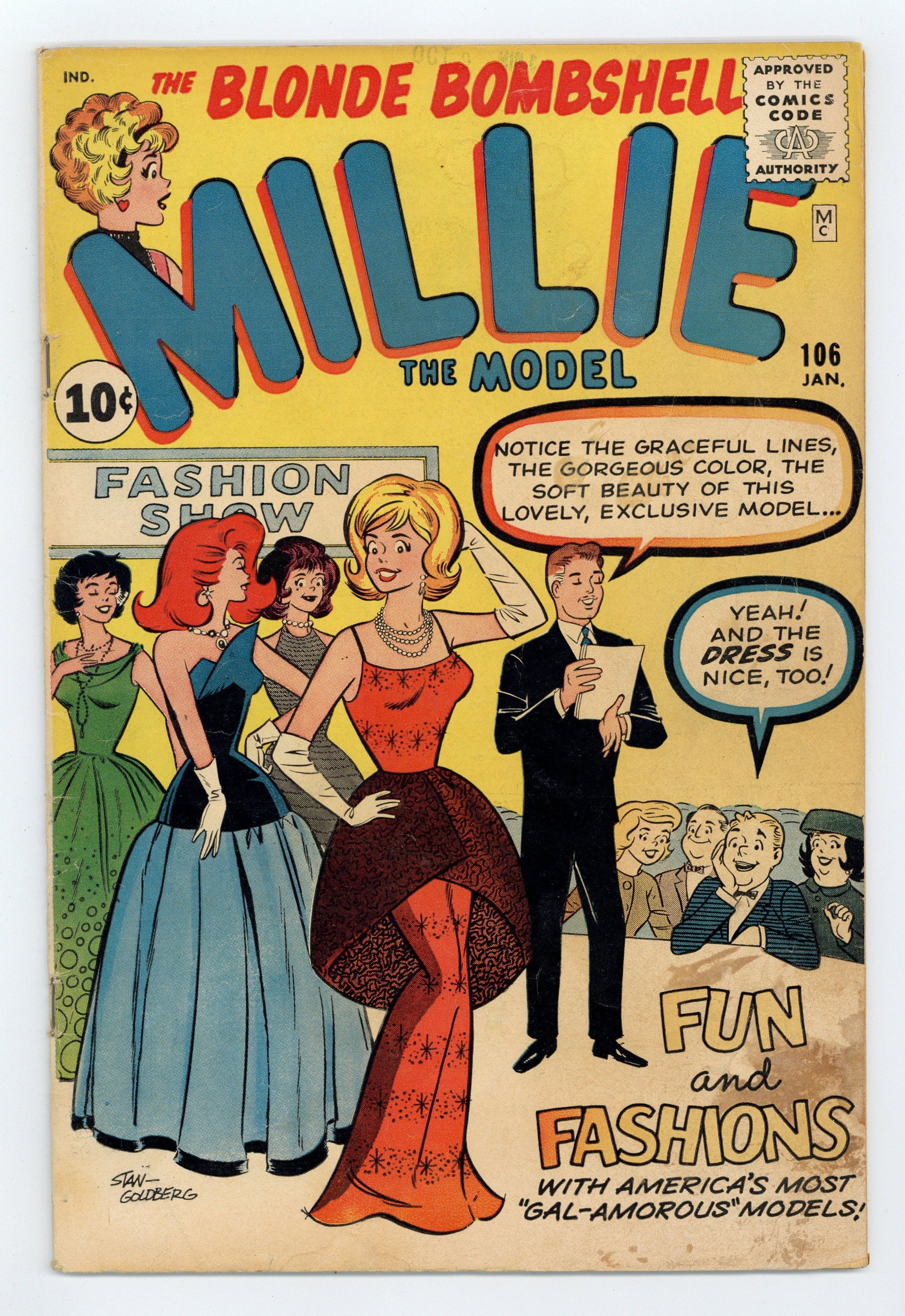 Cover art by Stan Goldberg. Pity the Poor Pickets!, A New Leaf for Chili!, When Millie Was a Teen-Ager -- The Keys to the Car!, and Goodbye to Clicker starring Millie the Model. Stories by Stan Lee, art by Stan Goldberg. Millie's Fashion Pin-up paper dolls. Chili's Classy Cut-out! paper dolls. Millie's Party Pretties! Time for Toni paper dolls. Millie's Cartoon Cut-Out! The Contest text story. 36 pgs. $0.10. Cover price $0.10.