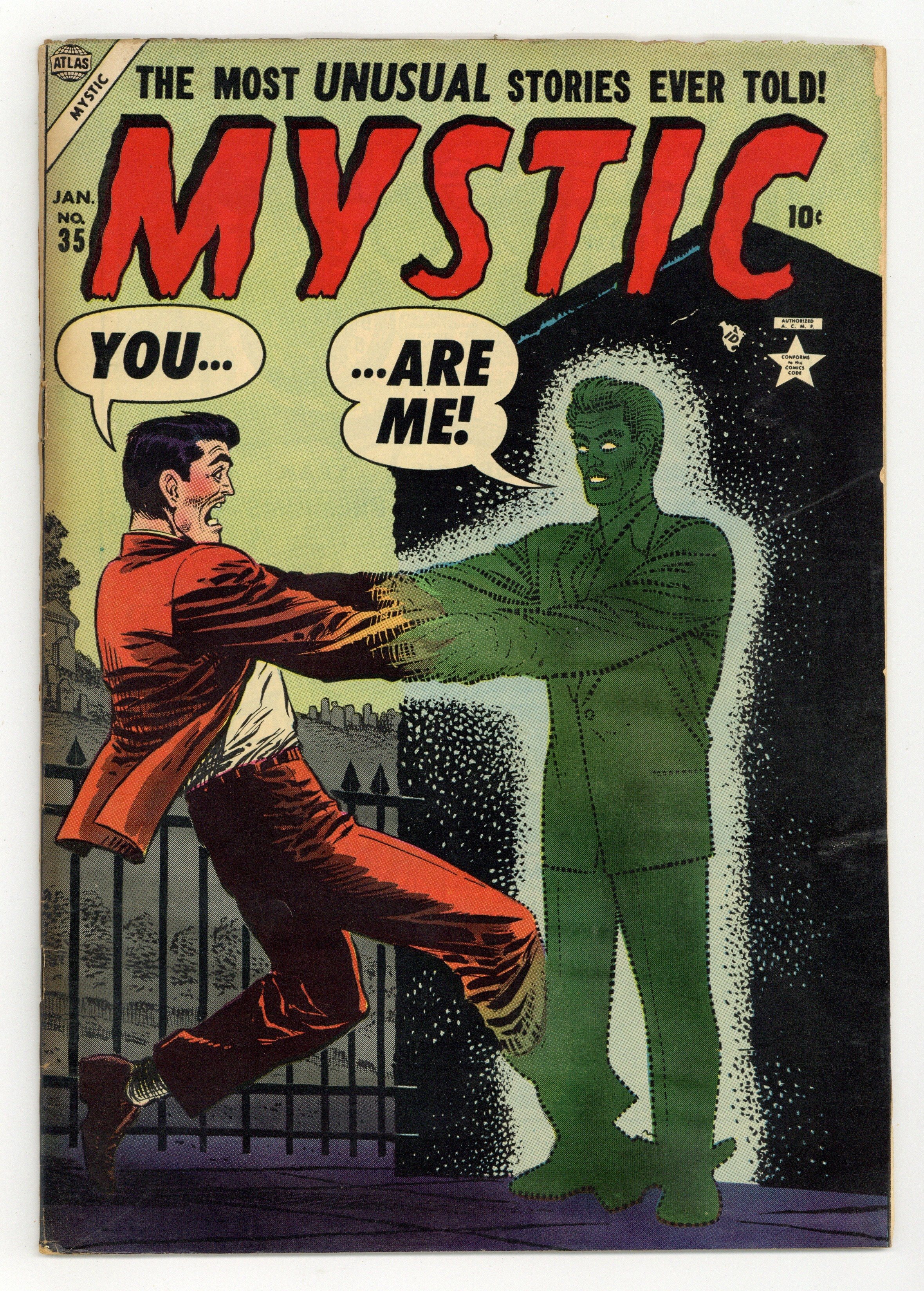 The Man Who Killed the Devil!, art by art by Dick Ayers; A man discovers a book with instructions for slaying the Devil and decides the fame would be so great that he will chance it. Fatal Treasure text story. Friend or Foe, art by Robert Q. Sale; Aliens from another planet are divided on how to treat the humans when their spacecraft lands. The Itch!, art by Al Hartley; A miser who is doused in itching powder by a client he cheated goes to an underworld doctor who promises relief for his itching. You Are Me!, pencils by John Forte; A man meets a duplicate version of himself from another dimension and strangles him so that there will be only one of them in existence. What Happened in Midville; An evil postman gives small boxes to everyone in town that they can wish an evil into, but they must accept an unknown box from one of neighbors as part of the deal. 36 pgs. $0.10. Cover price $0.10.