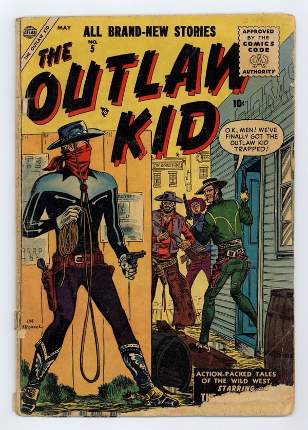 Cover art by Joe Maneely. "Two of a Kind," art by Doug Wildey; The Outlaw Kid thwarts a bank robbery in Caliber City, but one of the robbers manages to escape; Setting up camp outside of town the lone gunman wonders how he can get even with the Kid and comes up with a solution; The next day the man returns to town disguised as the Outlaw Kid and robs the local general store in broad daylight and then flees the law. "The Newcomers," art by Doug Wildey; The Outlaw Kid is riding across the range when he comes across some locals, led by a man named Fargo, roughing up a recent Mexican immigrant and his son who have built a small farm outside of Caliber City; Disgusted by their racist attitudes towards the new comers, the Outlaw Kid comes to their rescue and chases them off. "Arizona Lawman" text story. "The Man Who Wouldn't Fight," art by John Romita; Outlaw Kid vs. Larkin and Mason. "The Flames of Violence," art by Doug Wildey; The Outlaw Kid is helping the sheriff of Caliber City keep a lynch mob away from Larkin a man who robbed a coach and is accused of murdering the driver, telling the mob that Larkin deserves the right to a fair trial; After quietly telling the sheriff to sneak Larkin out the back door, the Kid is assisted by a man named Mason who appears to believe that Larkin deserves a fair trial as well and the mob disburses. 36 pgs., full color. Cover price $0.10.