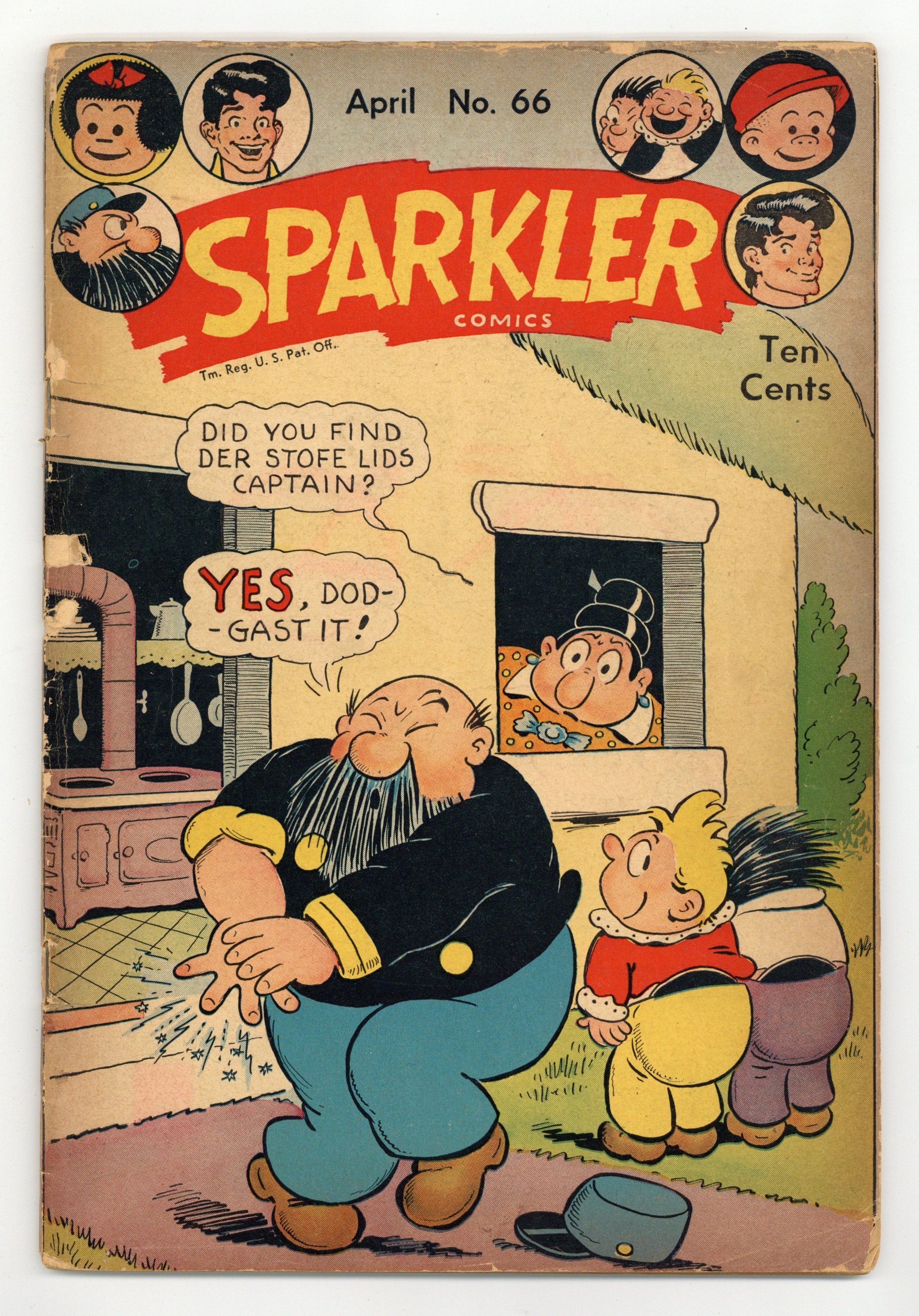 Stories and art by Burne Hogarth, Al Capp, Ernie Bushmiller, Jack Sparling, Charlie Plumb, Bernard Dibble, Ed Dodd, Rudolph Dirks, J. P. Williams, Arnie Mossler and Raeburn Van Buren. United's anthology featured reprints of early comic strips, including Tarzan, Li'l Abner and Nancy. Tarzan has a plan to free Don Macabre's captive workers from the tunnel. Burke finds the greatest baseball player ever in a remote Central American country, and sets out to bring him back to the US. Sparkling Stars of the Air (radio, that is) focuses on the King Cole Trio, the early group featuring Nat King Cole. Plus a Li'l Abner storyline by Al Capp and the Ripley-like Strange as It Seems. Li'l Abner; Hap Hopper; Nancy; Captain and the Kids; Tarzan; Sparkler Salutes; Ella Cinders; Sparkling Stars of the Air; Bill Bumlin; Back Home Again; Strange as It Seems; Abbie an Slats; El Bombo. 48 pages, Full Color. Cover price $0.10.