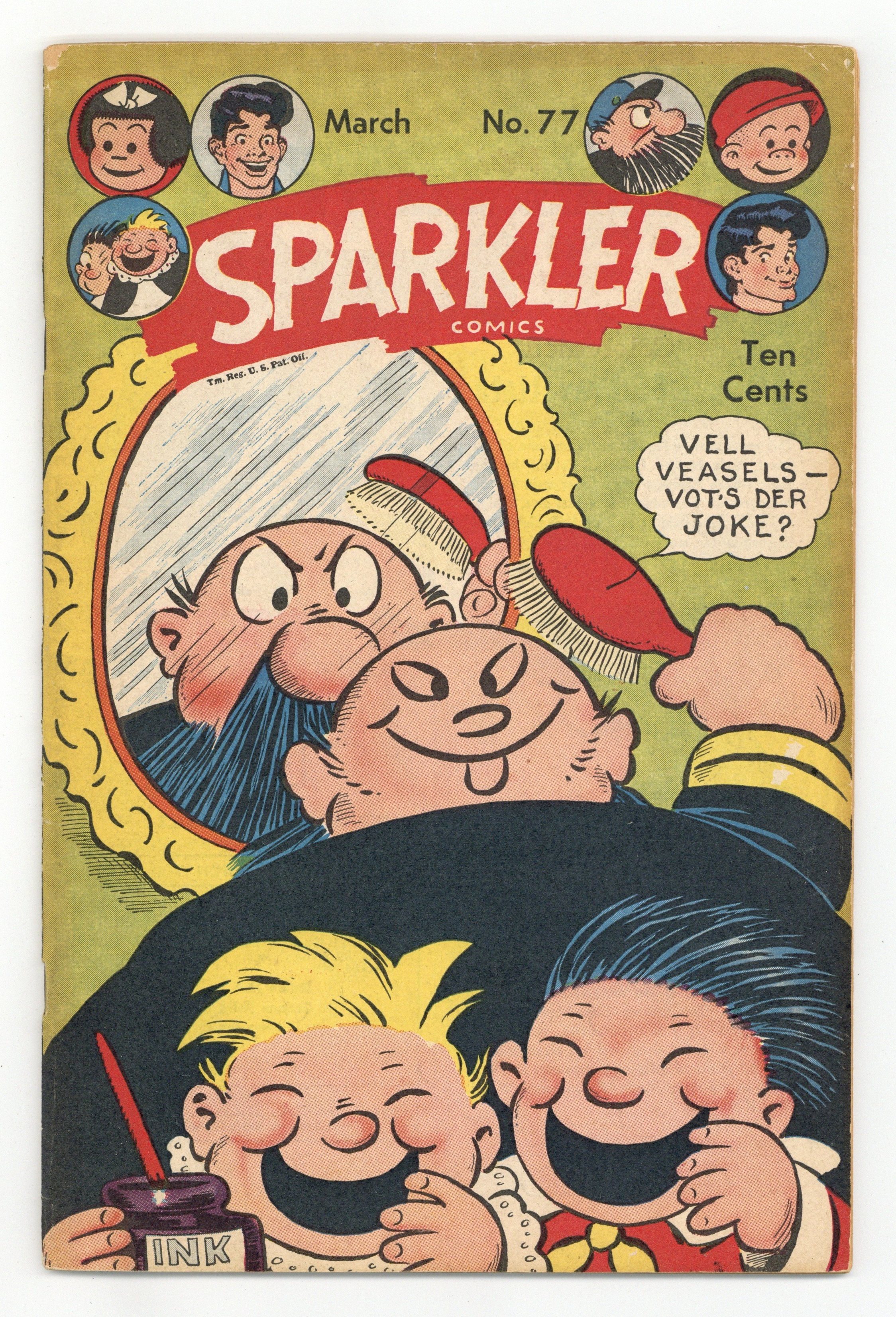 Published Mar 1948 by United Features Syndicate.$45.00Cover by Ernie Bushmiller. Stories and art by Burne Hogarth, Al Capp, Ernie Bushmiller, Jack Sparling, Charlie Plumb, Bernard Dibble, Ed Dodd, Rudolph Dirks, J. P. Williams, Arnie Mossler and Raeburn Van Buren. United's anthology featured reprints of early comic strips, including Tarzan, Li'l Abner and Nancy. Stranded in the Arctic, the Kids elude the Captain and Mama, annoy the locals and antagonize the wildlife. Sue Groggins gets caught up in Willoby's scheme for making artificial diamonds. Hap Hopper sets out to find missing scientist Dr. Dome before his rival Gabby Galt finds him. Plus a Li'l Abner storyline by Al Capp. Li'l Abner; Hap Hopper; Nancy; Captain and the Kids; Tarzan; Dink O'Day; Abbie an Slats. 48 pages, Full Color. Cover price $0.10.