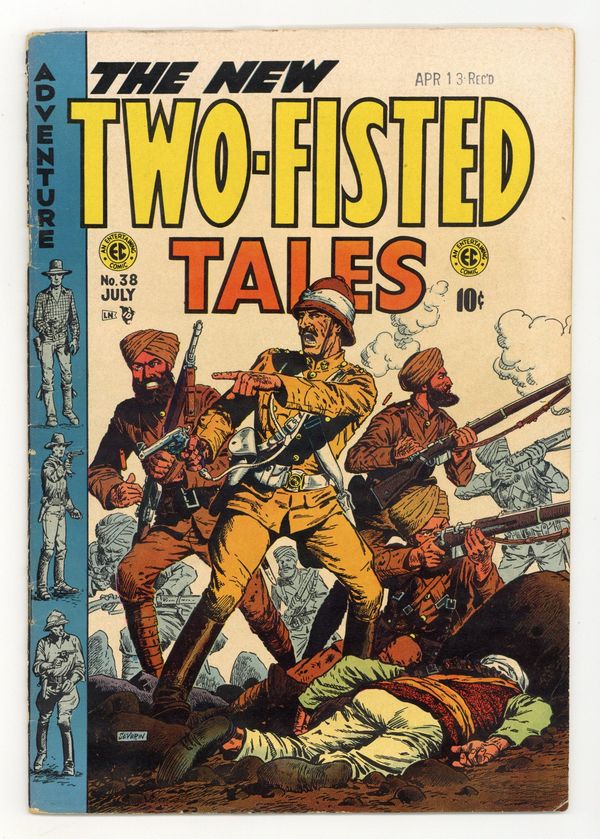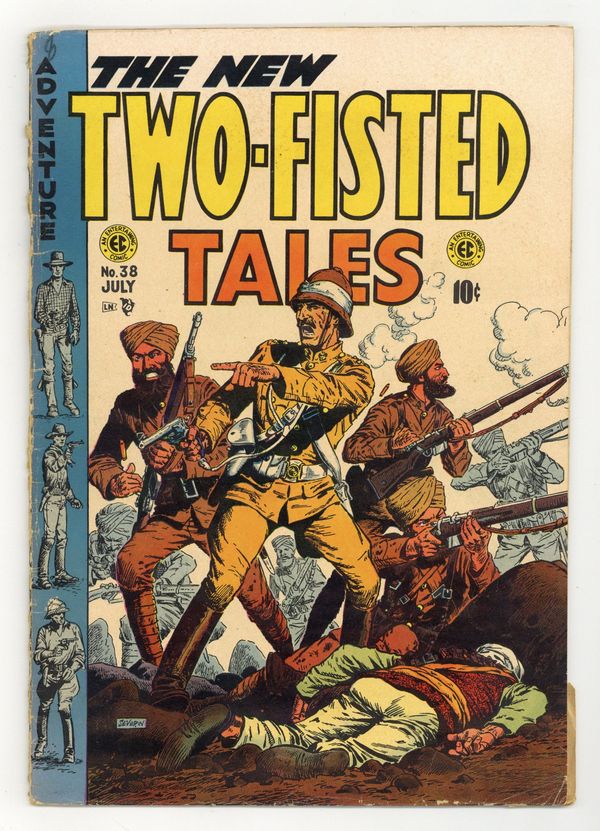 Cover by John Severin. Stories by Colin Dawkins. Art by John Severin. Harvey Kurtzman's legendary series enlisted top EC artists for gritty tales of war and adventure. Soldier of fortune Ruby Ed Coffey follows a stolen statue to a lost city and a hidden uranium lode. A Harvard-educated Cheyenne chieftain's son returns to challenge Flaming Arrow, who killed his father and wants to lead his people to war. The new ranch hand seems like a coward to the other cowboys, until they encounter a band of rustlers. Lost City!; Warpath!; Two-Fisted Men: Captain Sir Richard Francis Burton; Bullets!; Stampede! 36 pages, Full Color. Cover price $0.10.
