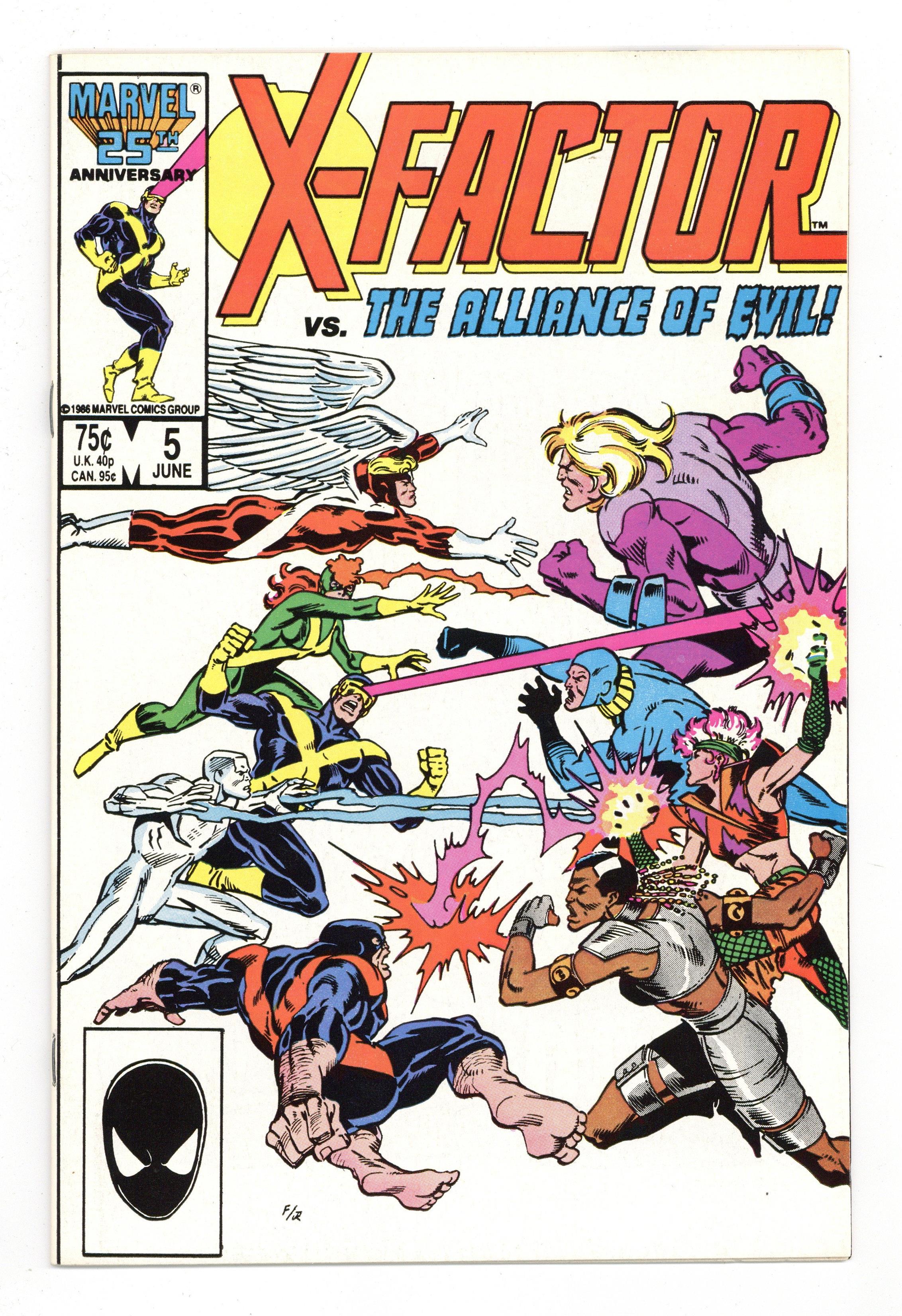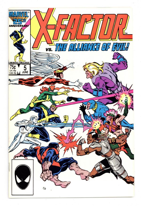 Direct Edition. "Tapped Out!" Part 1 of 2. 1st appearance of Apocalypse (shadowed cameo). Story by Bob Layton. Art by Jackson Guice and Joe Rubinstein. Cover by Ron Frenz and Joe Rubinstein. It's a classic super-hero/super-villain throw-down when X-Factor must battle the Alliance of Evil (Frenzy, Tower, Stinger, and Timeshadow) for the life of a mutant. Featuring a new menace by the name of Apocalypse, an evil mutant who will become a major thorn in the sides of the X-Men and X-Factor. Cover price $0.75.
