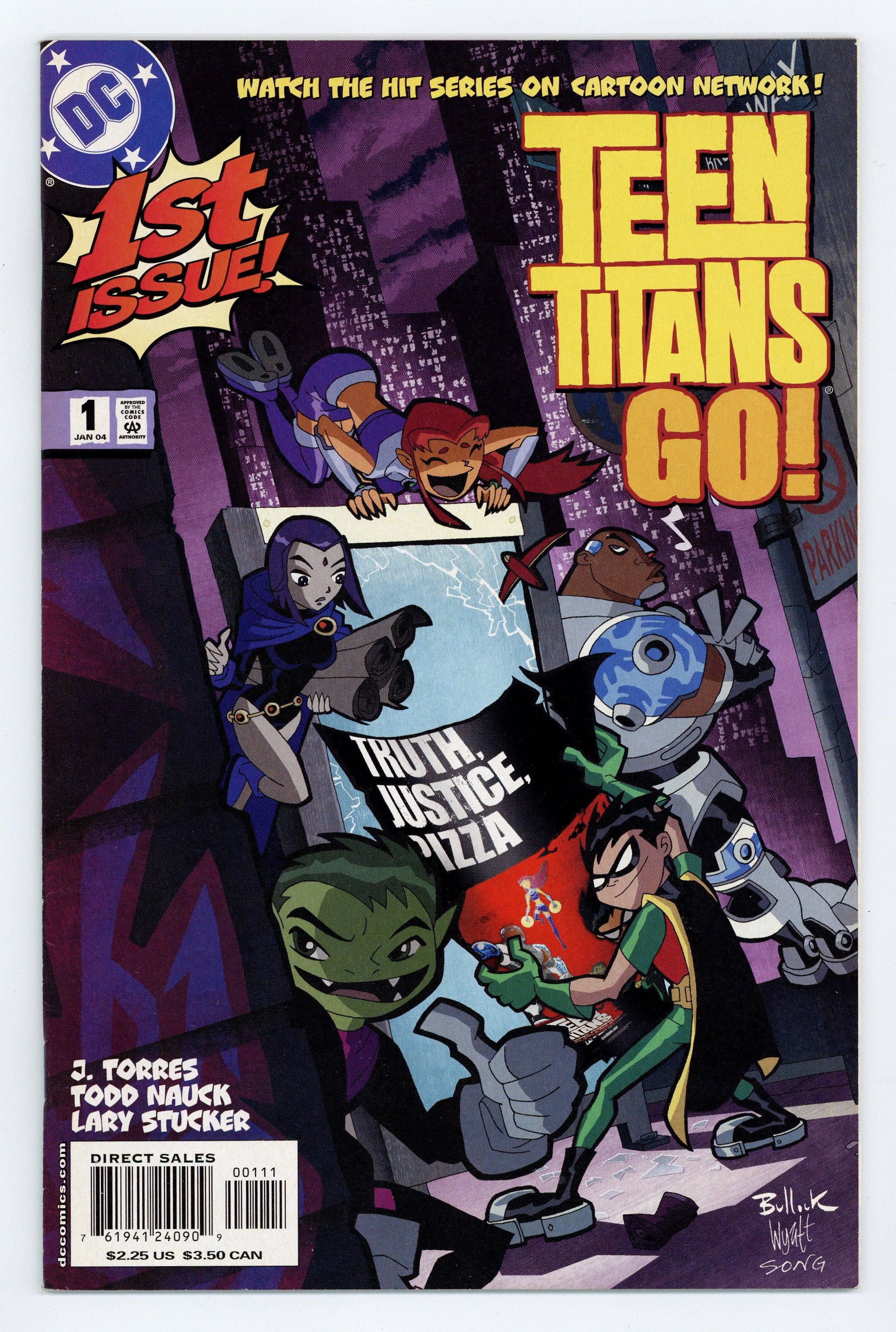 First printing. Direct Edition. WRITTEN BY J. TORRES, ART BY TODD NAUCK AND LARY STUCKER; COVER BY DAVE BULLOCK In stores November 26. From Cartoon Network, it's TV's hottest new super-team! Join Robin and his band of teenage heroes: the brave Cyborg, funny guy Beast Boy, the naive but seriously hot (and way powerful) Starfire, and the moody goth-girl Raven as they battle for truth, justice and pizza! FC, 32 PG.$2.25 Cover price $2.25.