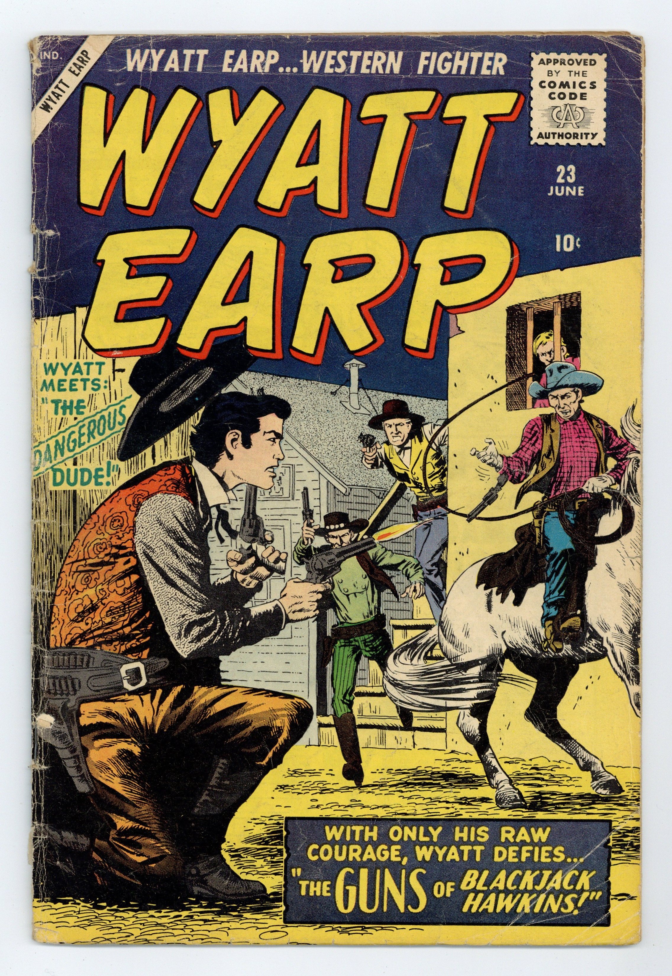 Cover art by John Severin. The Dangerous Dude starring Wyatt Earp, script by Stan Lee, art by Dick Ayers. In the Still of the Night! starring Wyatt Earp, script by Stan Lee, art by Dick Ayers. The Guns of Blackjack Hawkins! starring Wyatt Earp, script by Stan Lee, art by Dick Ayers. Range Mystery text story. When the Raiders Strike starring Kid From Texas, art by Joe Sinnott. 36 pgs. $0.10. Cover price $0.10.