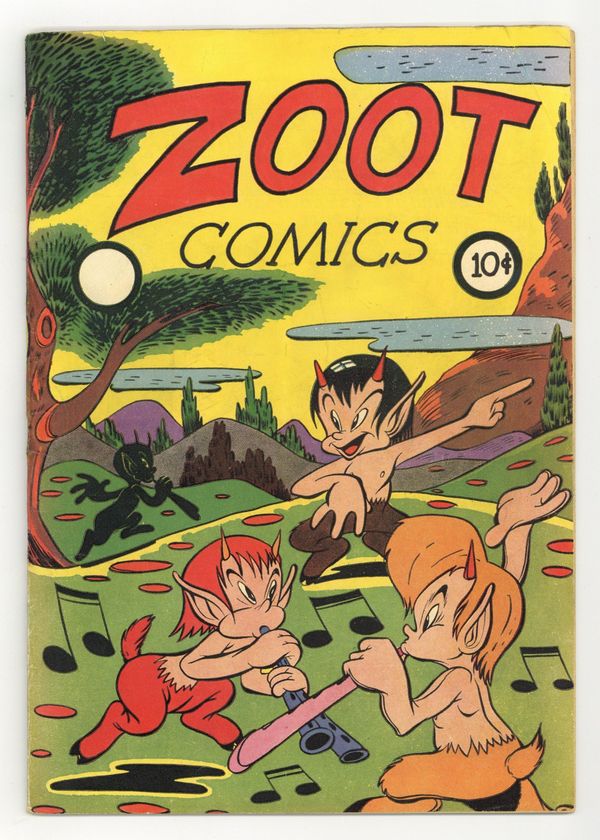 Art by Len Short and others. Kids' humor comics and funny-animal hijinks from Fox Feature Syndicate. A funny-animal spoof of quiz shows, with an owl as the M.C.; Nanny and Boots are a little-girl-and-dog duo in the Buttons and Mindy mold; Nightclub owner and amateur detective Pussy Katnip discovers that gangsters have kidnapped a baby panda from the zoo. Quizzo; Nanny and Boots; Pinky Penguin; Timmy and Tubby; Pussy Katnip: Orchids for Temptation; Gussie the Gob. 32 pages, Full Color. Cover price $0.10.