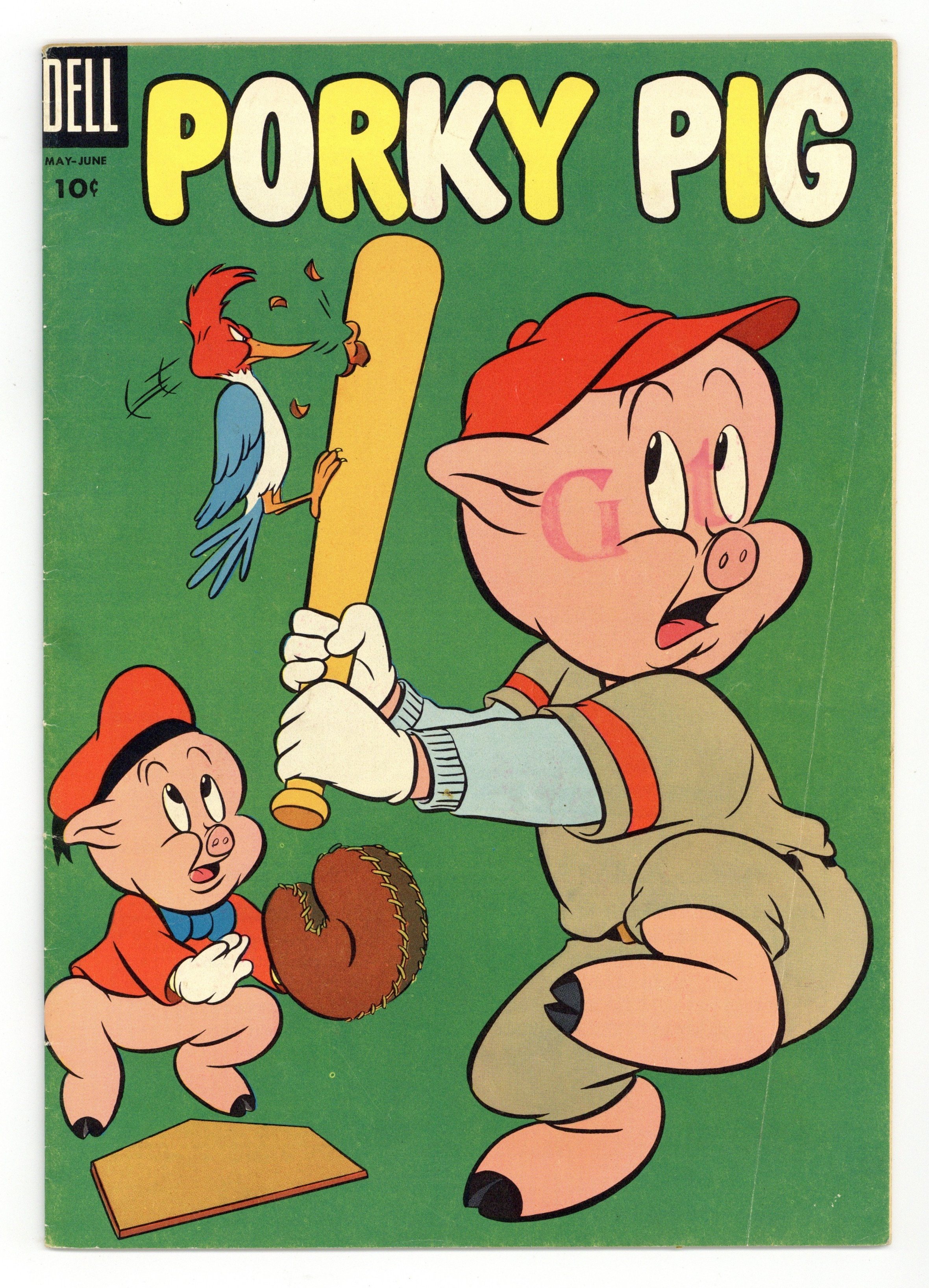 Comic book starring the Warner Bros. cartoon character Porky Pig. Robot Bird; Porky buys a parakeet for Petunia, but it escapes its cage; Bugs is working for a company that makes robot bird retrievers and tries to use one to capture the parakeet. Porky Pig Meets the Great Optic; Porky says he can't be hypnotized, but when he volunteers to be a subject at a performance of "The Great Optic," he is, of course, immediately hypnotized. The Builder; Porky decides that he'll build a summer cabin for Petunia on a lot at the lake; Porky goes through the usual construction mishaps and then finds himself stranded in the middle of the lake when the lot breaks loose and slides into the lake. The Rag Rug Roundup; Petunia is weaving a rag rug for a hobby show and sends Porky to collect rags for it. Turtle Race; Porky and Cicero have a turtle race. Cicero cheats by using a roller skate. 36 pages, full color. Cover price $0.10.