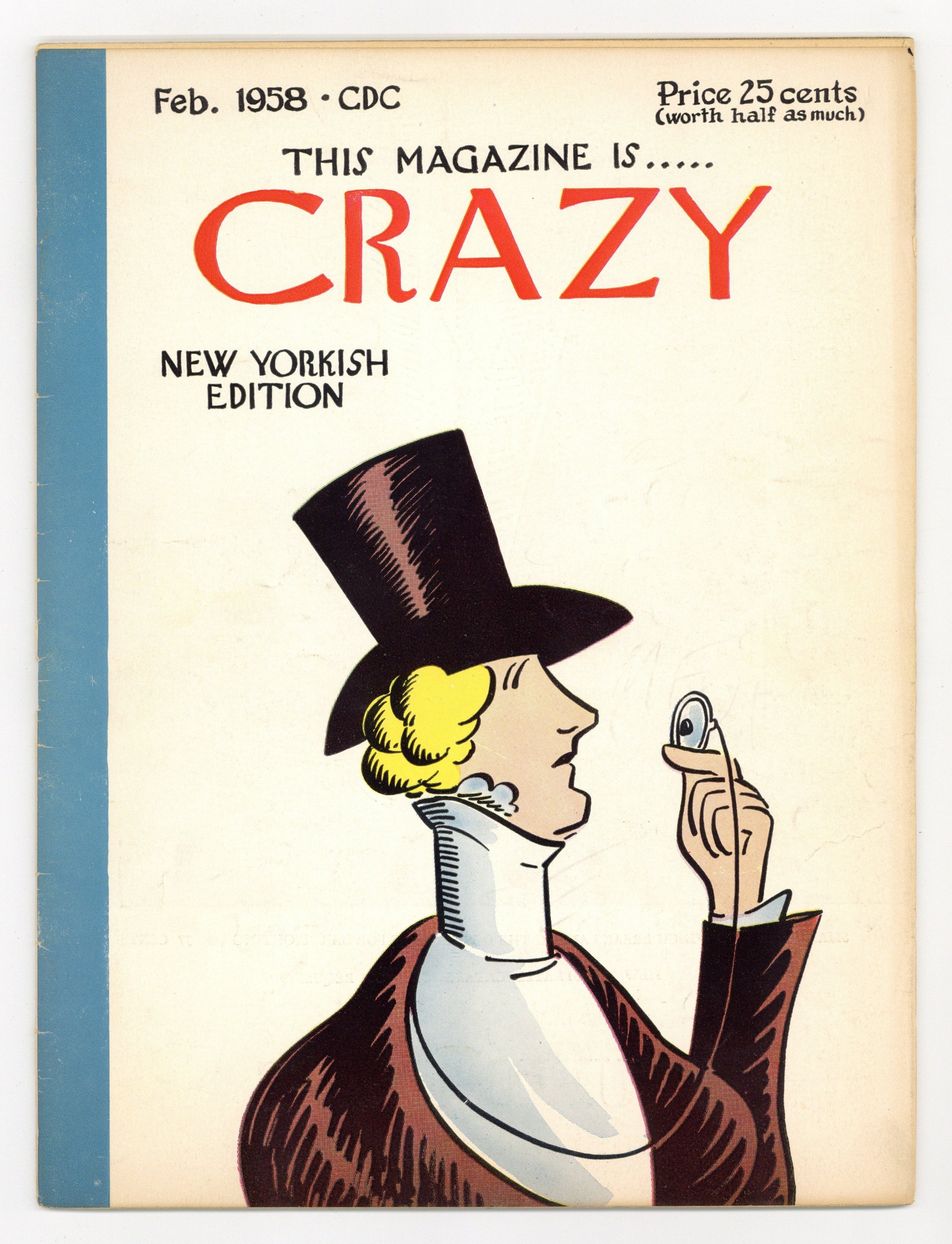 Stories and art by Tony Couch and others. Charlton's Mad imitator continues its hit-or-miss parodies of 1950s pop culture. A parody of Beetle Bailey comic strips and Elvis's famous induction into the Army. A parody of James Thurber's New Yorker stories. Spoofs of 1950s advertising, including beer, art instruction, and vodka. The cover is a parody of New Yorker magazine and its famous mascot, Eustace Tilley. Stupid Glass; Goings on About Town; Fred R. J. Knockworth Gets the Bad News with a Telegram; The New Yorkish; Fables for Our Time; Our Far Flung Correspondents; The Current Cinema; My Beer Is Swinegold the Dry Beer!; It's All in Your Mind!; Crazy Goes to a Party!!; Pelvis Is Drafted; Believe It or Nuts!; The Man with the Grey Flannel Mouth; Anyone Can Draw!!; Know Yourself; A Morbid Moment; New Golden Dill Soap Makes Bubbles Better; The Secret of a Real Martini Is in Dogschmidt's Vodka. 8.5-in. x 11-in., 64 pages, B&W. Cover price $0.25.