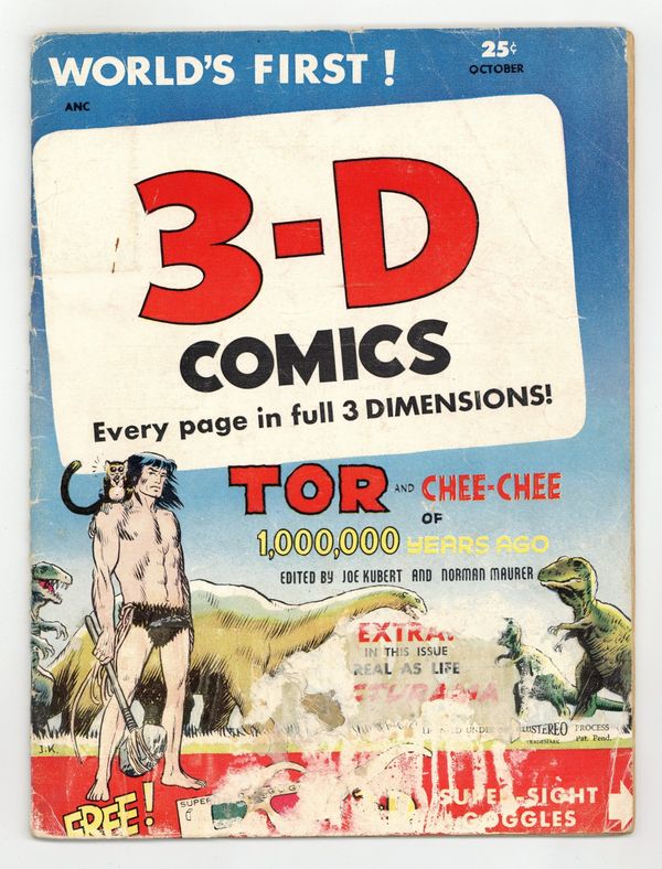 Cover by Joe Kubert. Stories and art by Joe Kubert, Russ Heath and Norman Maurer. Numbering continues from One Million Years Ago (1953 St. John) #1. Comics legend Joe Kubert won fans early in his career with his tales of Tor, a caveman struggling for survival in a world where humans co-exist with dinosaurs. Kubert and St. John push the envelope with some of the earliest 3-D comics. Three versions of issue #2 exist; all are called Vol. 1 #2 in the indicia. This version is standard Silver Age size and includes the same contents as #2B. Tor aids an underground tribe in their battle with a Cave Snake. Then he battles a giant turtle, escapes a forest fire, and witnesses a dinosaur battle. Plus illustrations of dinosaurs by legendary artist Russ Heath. Tor; 1,000,000 B.C. History of Prehistoric Animals: Triceratops, Brontosaurus; Wizard of Ugghh; Danny Dreams. Standard size: 7 1/2-in. x 10-in. 36 pages, B&W with 3-D effects. Cover price $0.25.