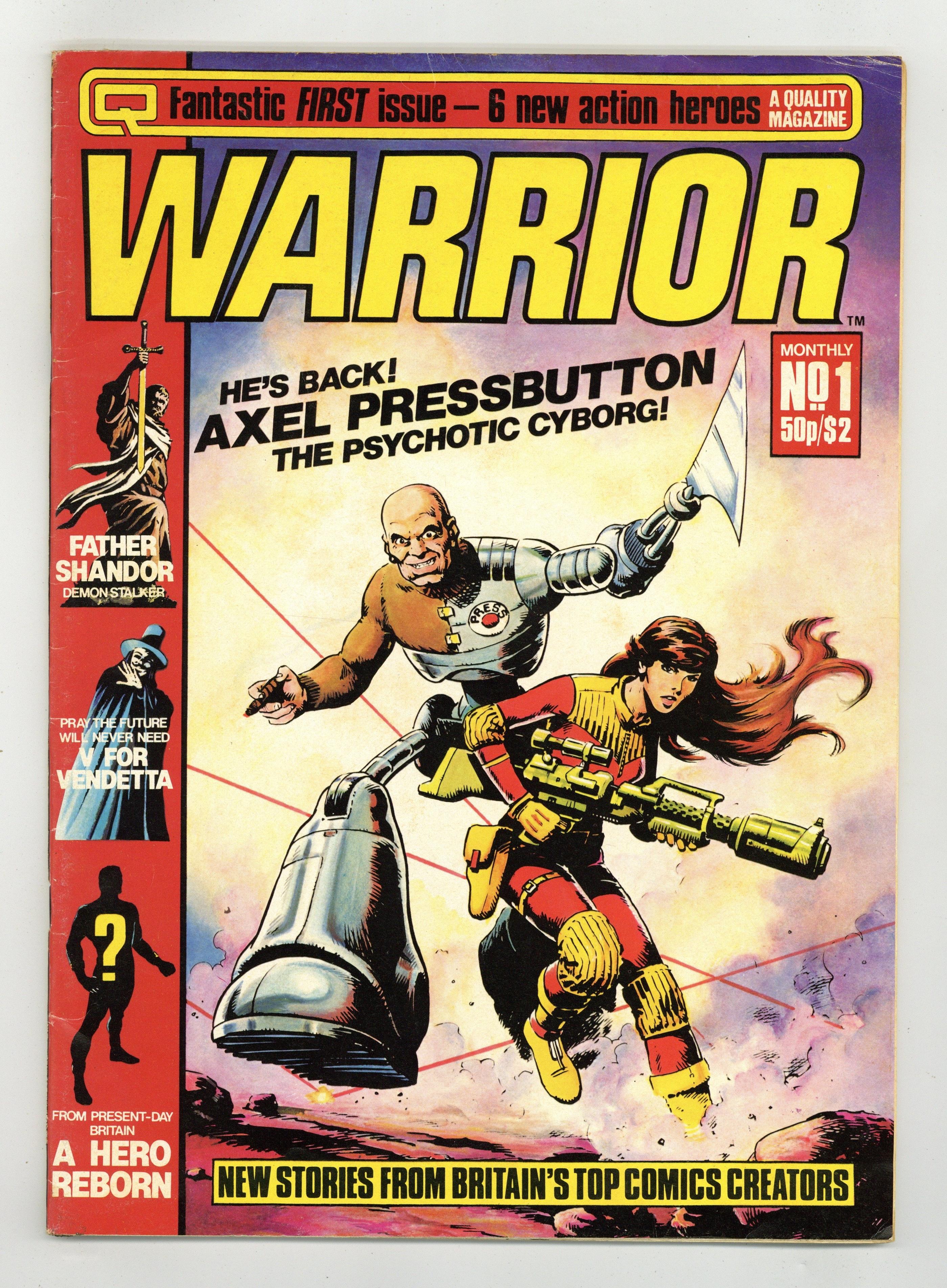 Here it is, the UK comic anthology magazine that started it all. Back in 1982, Warrior hit the newsstands featuring some of the best and brightest of Britain's comic talent, including the first appearance of Alan Moore's MarvelMan, who eventually becomes Miracleman in the U.S. Axel Pressbutton cover by Steve Dillon; "A Dream of Flying" (Marvelman) by Alan Moore & Garry Leach; "The Mightiest Man in the Universe" by Dez Skinn. A look back at Marvelman; "The Spiral Path" by Steve Parkhouse; "A True Story" by Steve Moore and Dave Gibbons; "The Legend of Prester John" by Steve Moore & John Bolton; "V for Vendetta" by Alan Moore and David Lloyd; "Father Shandor, Demon Stalker" by Steve Moore & John Bolton; "Laser Eraser & Pressbutton" by Pedro Henry & Steve Dillon; "Warriors All" a look at the creative talent from this issue. Cover price $2.00.