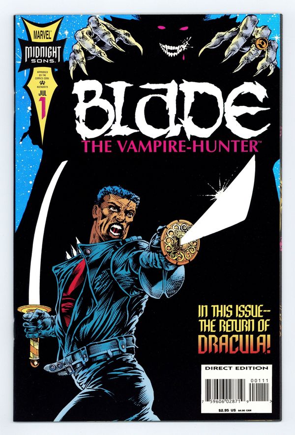 The other Nightstalkers are dead, and Blade stands alone against the vampires invading the Marvel Universe! Among them is Dracula, and the devastating means of his return is beyond your wildest nightmares! Written by Ian Edginton. Art by Doug Wheatley and Chris Ivy. Foil-stamped cover. Cover price $2.95.