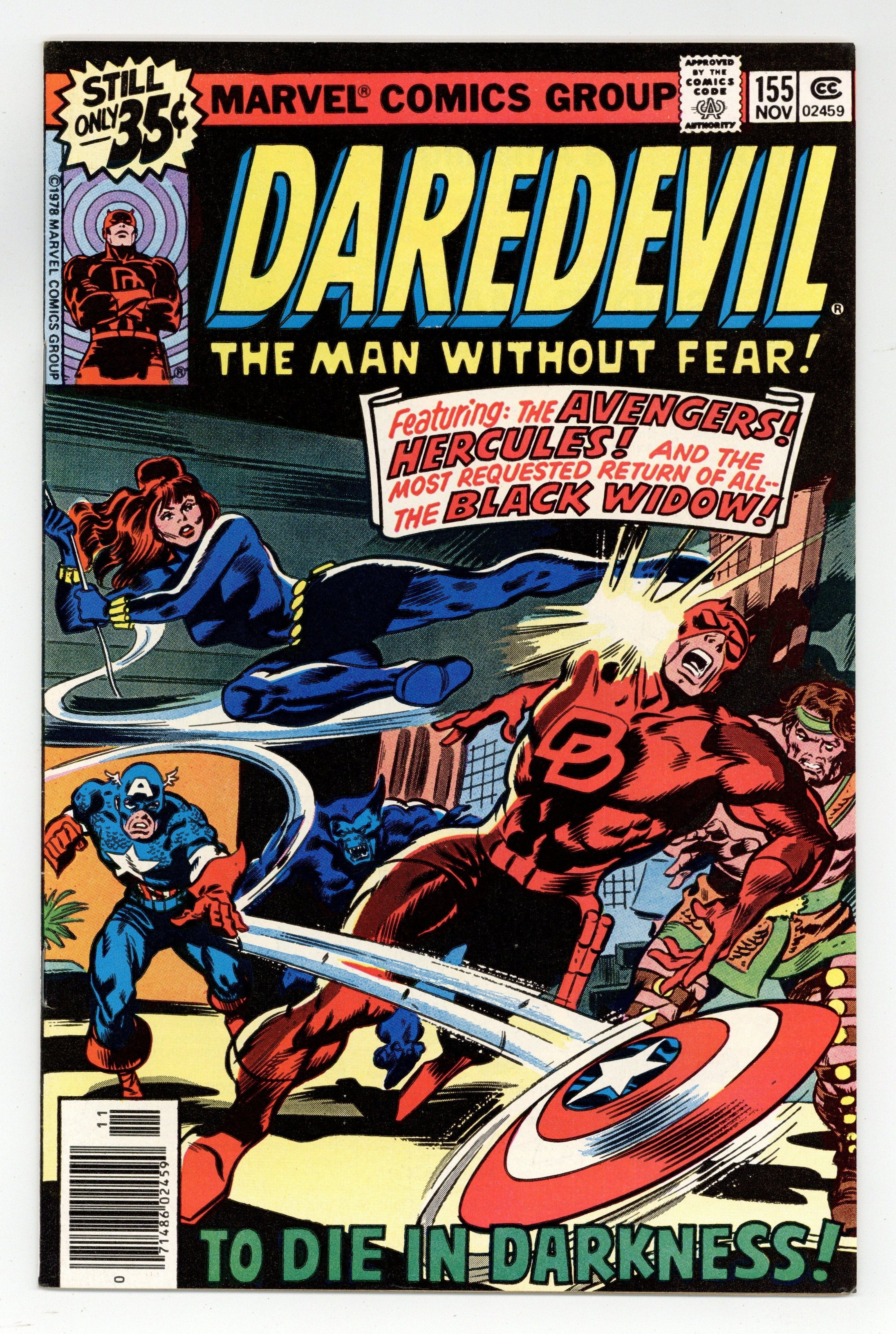 Cover pencils by Gene Colan, inks by Frank Springer. The Avengers (Captain America, the Black Widow, the Beast) and Hercules guest stars in The Man Without Fear?, script by Roger McKenzie, pencils by Frank Robbins, inks by Frank Springer; DD starts getting mysterious headaches that interfere with his daily activities; Matt hires Becky as his new secretary; Daredevil invades Avenger's mansion to confront a visiting Black Widow; Death-Stalker appearance. 36 pgs. Cover price $0.35. Cover price $0.35.