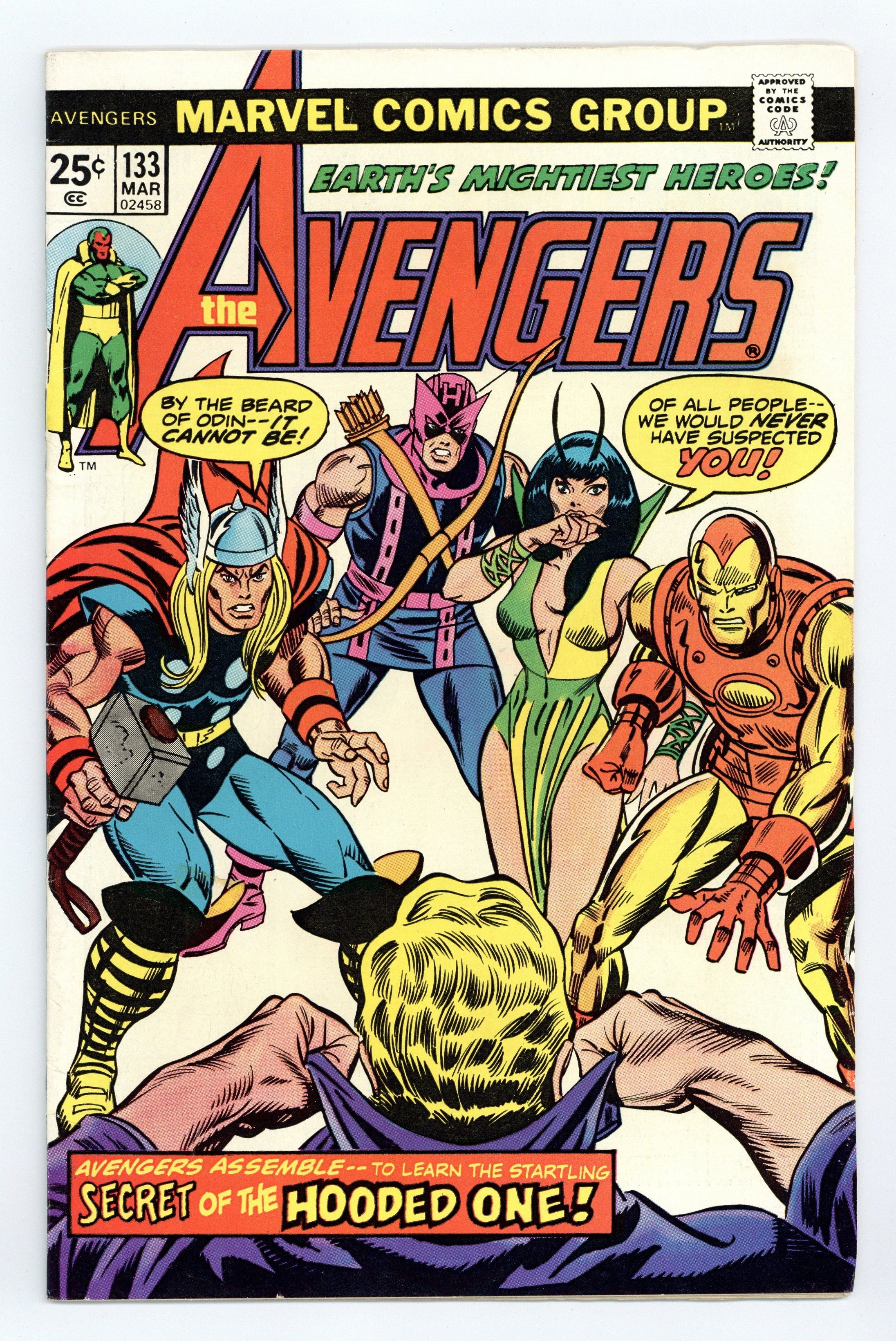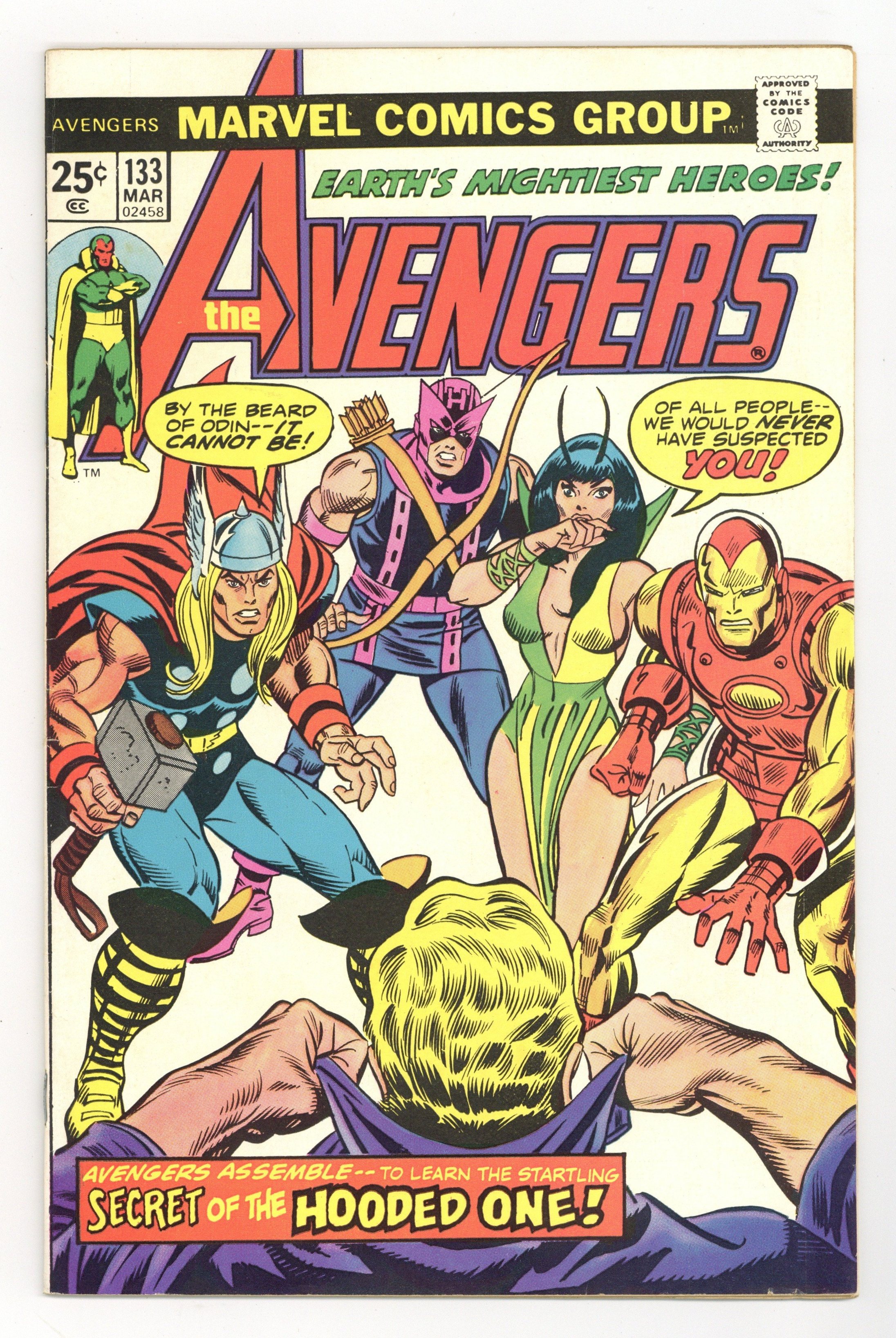 $25.50"Yesterday and Beyond…" Script by Steve Englehart. Art by Sal Buscema (layouts) and Joe Staton (finishes). Cover by Gil Kane, Dave Cockrum, and Frank Giacoia. The Celestial Madonna saga continues after the Avengers narrowly defeated Kang in Giant-Size Avengers 3. As a reward for thwarting the Conqueror, Immortus sends Mantis and the Vision on separate journeys through time to discover their respective origins. The Vision's path of discovery starts in the laboratory of Dr. Phineas T. Horton during the early days of World War II. While Mantis' history lesson begins eons ago on Hala, the home planet of the Kree. Meanwhile inside Avengers Mansion, the Scarlet Witch trains with Agatha Harkness to hone her mutant powers. Origin of the Vision. Origin of Mantis. Cameo appearances by Moondragon, Libra, and the Cotati. Flashback cameos by the original Human Torch, the Sentinels, Skrullls, and Kree. Avengers Lineup: Iron Man, Hawkeye, Mantis, Scarlet Witch, Thor, and the Vision. (Note: The first subplot connecting the Vision to the original Human Torch was introduced in Avengers 93.) 36 pgs. Cover price $0.25.