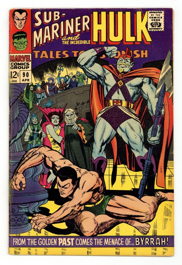 Cover by Jack Kirby and Vince Colletta. To Be Beaten by Byrrah!, script by Stan Lee, art by Bill Everett and Marie Severin; Namor's cousin wins the favor of the populace of Atlantis as well as the Atlantean council by belittling the regime of the Sub-Mariner as violent and unstable; He challenges Namor to single combat for the right to rule and no one is more surprised than the avenging son when his powers desert him during the fight and Byrrah handily wins. The Abomination!, script by Stan Lee, art by Gil Kane; The Stranger leaves earth with the rampaging Hulk left behind to wreak destruction on his behalf; Turning back into his alter ego, Banner surrenders himself to Gamma base and tries to kill himself with radiation to stop the Hulk's destruction; Stopped before he can use his gamma machine, the machine is instead used by a foreign spy who is transformed into the Abomination; More powerful than even the Hulk, Abomination beats the jade giant down and kidnaps Betty as he escapes from the base. Letter from Bill Mantlo. 36 pgs., full color. $0.12. Cover price $0.12.