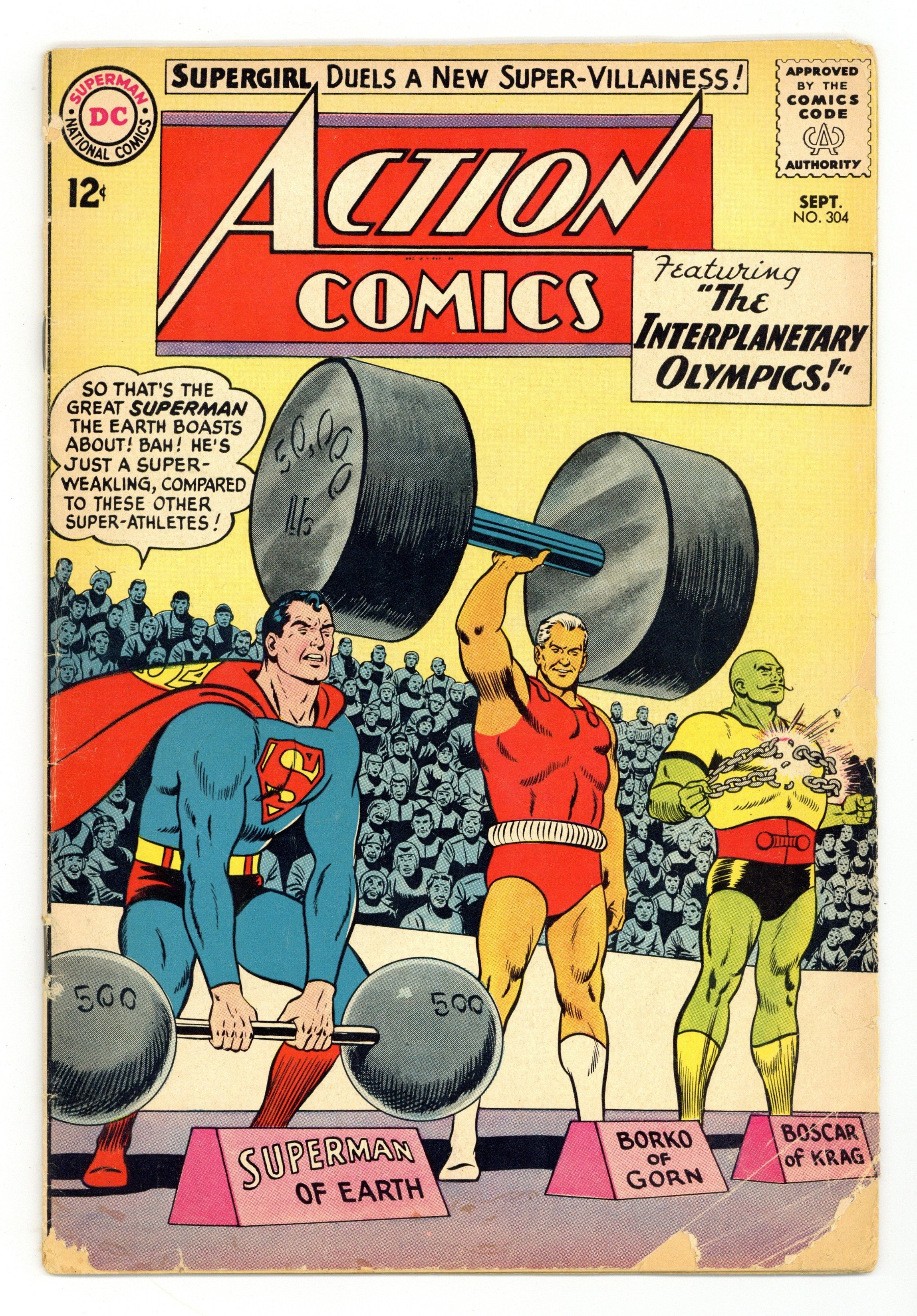 Cover pencils by Curt Swan, inks by Sheldon Moldoff. "The Interplanetary Olympics!", script by Leo Dorfman, pencils by Curt Swan, inks by George Klein; Superman and Lana are taken to the planet Vorn, where Superman is invited to compete in the Interplanetary Olympics. Supermen of America ad. One-page Shorty story by Henry Boltinoff. Origin & 1st appearance of Black Flame in "The Maid of Menace!", script by Leo Dorfman, art by Jim Mooney; Black Flame, a super-powered villainess, tells Supergirl she is her descendant from the 40th century, but Supergirl eventually deduces that she is really from Kandor, and wipes out her powers with Gold Kryptonite. 36 Pages, Full Color. $0.12 Cover price $0.12.