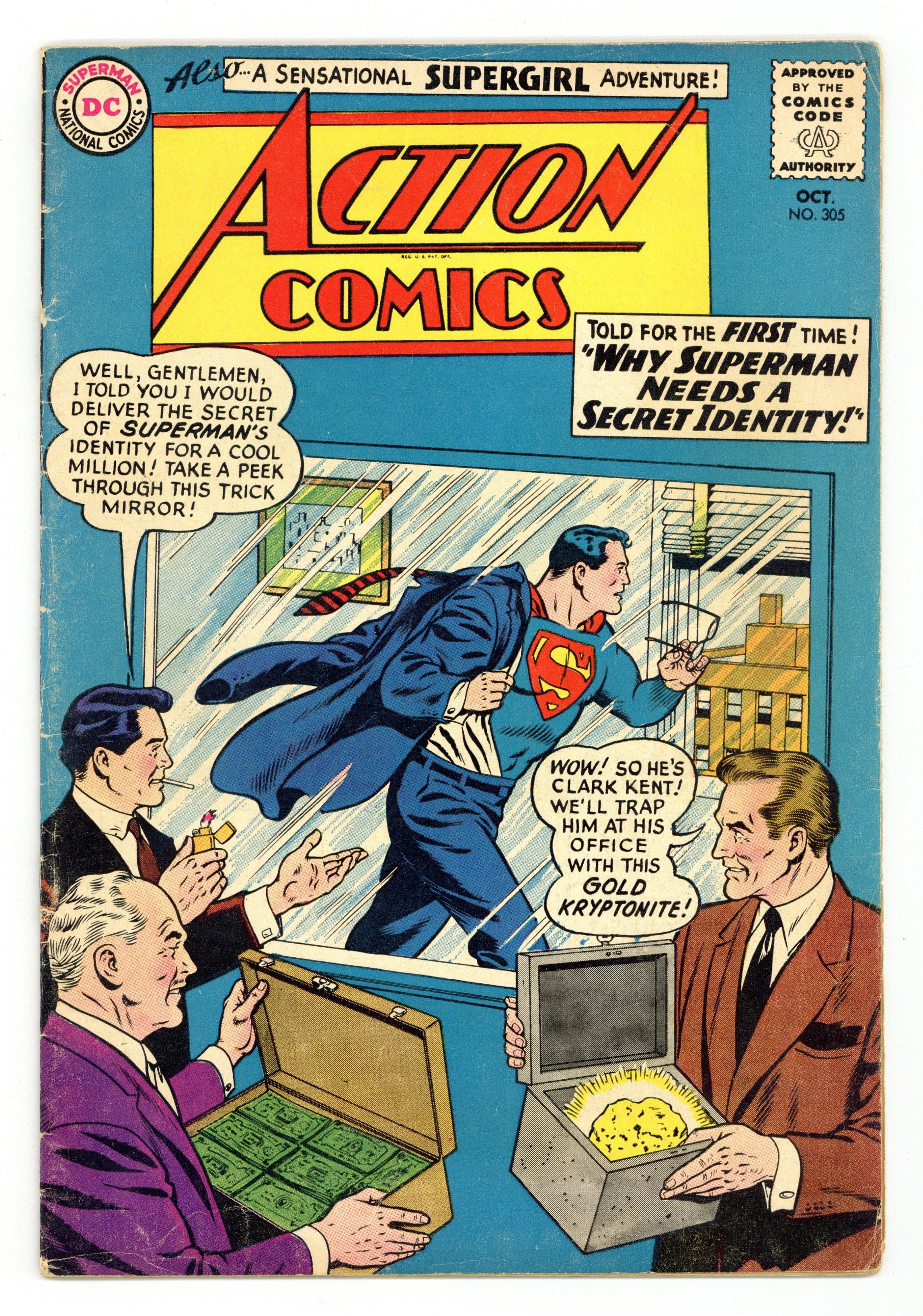 Cover pencils by Curt Swan, inks by George Klein. "Why Superman Needs a Secret Identity!", script by Leo Dorfman, pencils by Curt Swan, inks by George Klein; As Clark Kent is faced with a choice between saving his friends and protecting his secret identity, the reader is shown three different scenarios explaining why Superman needs to preserve that secret. The Flash ad. "The Girl Who Hated Supergirl!", script by Leo Dorfman, art by Jim Mooney and John Forte (some panels); Karen Blair hates Supergirl because she believes that the rocket that brought Supergirl to Earth caused an accident that killed her father and crippled her brother. One-page Super-Turtle story by Henry Boltinoff. 36 Pages, Full Color. $0.12 Cover price $0.12.