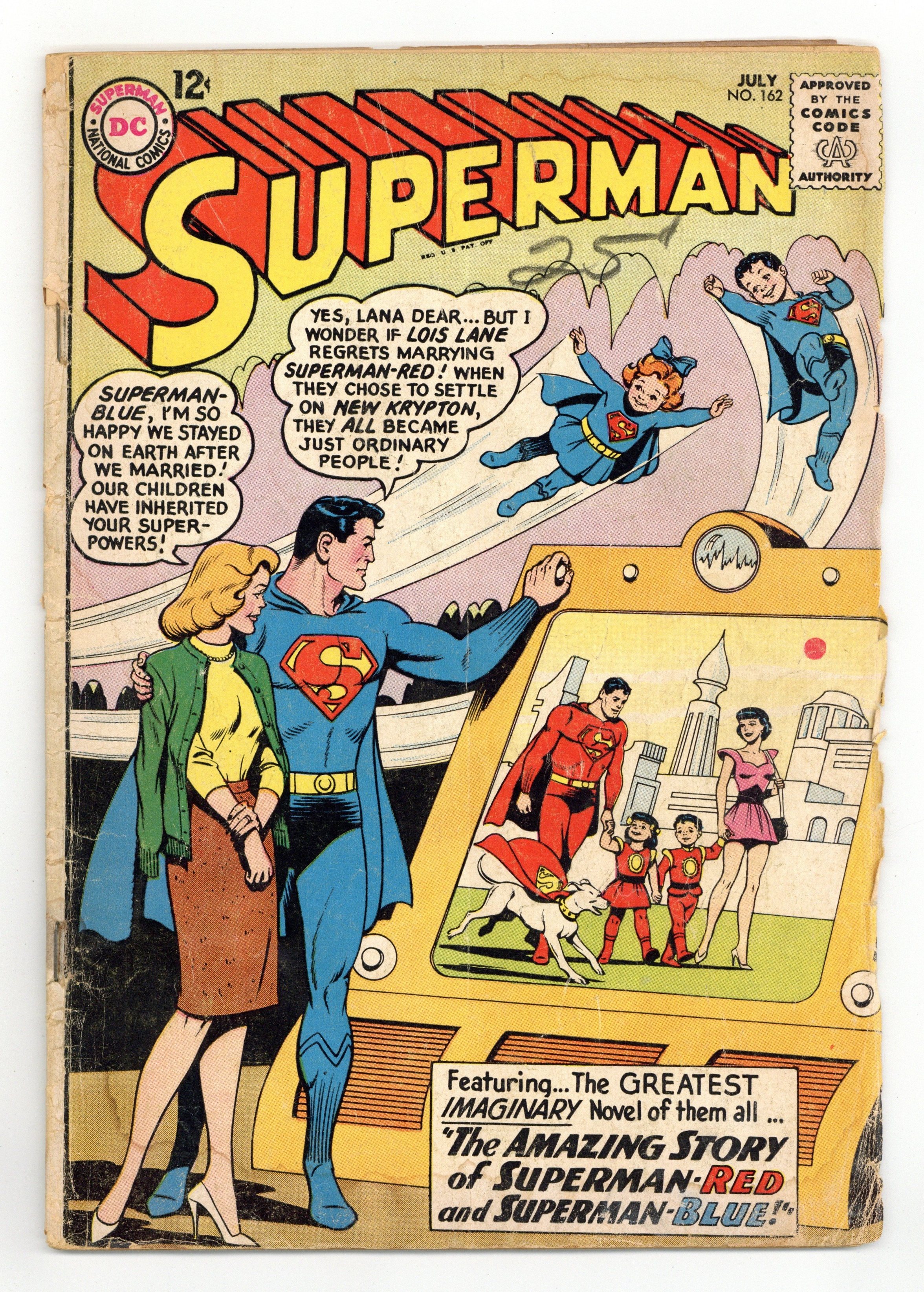 Cover art by Kurt Schaffenberger. The Titanic Twins! [The Amazing Story of Superman-Red and Superman-Blue! part 1], script by Leo Dorfman, pencils by Curt Swan, inks by George Klein; Superman splits into two Supermen in this classic, oft-reprinted story. The Anti-Evil Ray! [The Amazing Story of Superman-Red and Superman-Blue! part 2]; Luthor, Brainiac, Phantom Zoners, Khruschev, and Castro reform; Lex Luthor cures all illnesses. A Tree Grows on Second Street public service announcement, script by Jack Schiff, art by Sheldon Moldoff. The End of Superman's Career! [The Amazing Story of Superman-Red and Superman-Blue! part 3]; The Supermen marry Lois Lane and Lana Lang; Jimmy Olsen marries Lucy Lane; Mr. Mxyzptlk reforms. Super-Turtle humor page by Henry Boltinoff. 36 Pages, Full Color. Cover price $0.12.